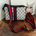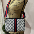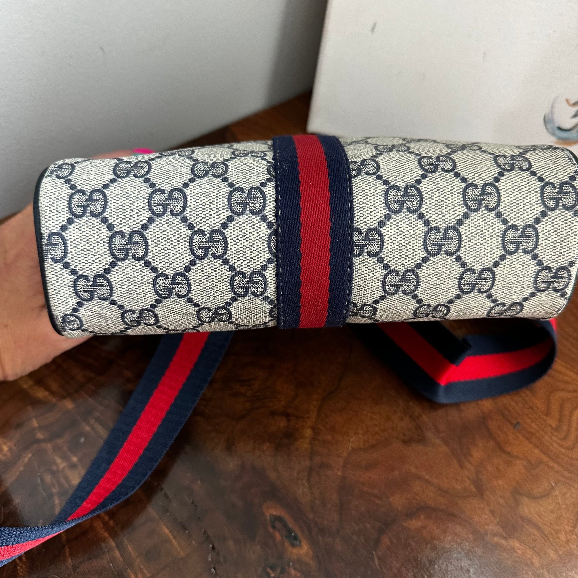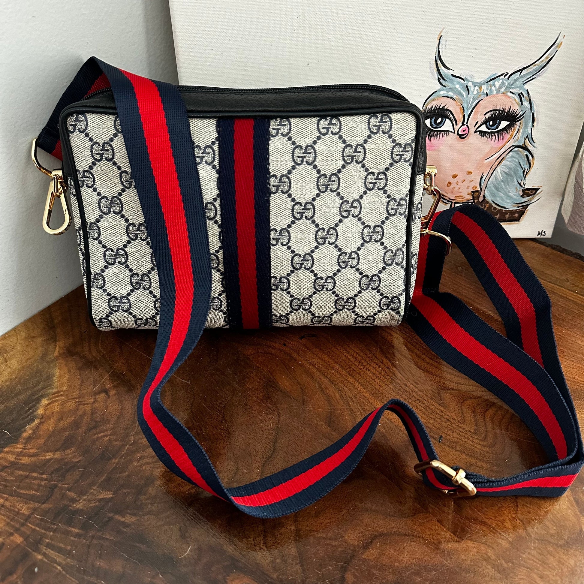 Here's another Junco in a classic Navy GG print with the fun red/blue stripe. This crossbody bag was created from an GUCCI Sherry Line Accessory Collection! It's got enough room for just the right amount of things, coming in at W8 x H6 x D2.75 inches.