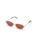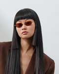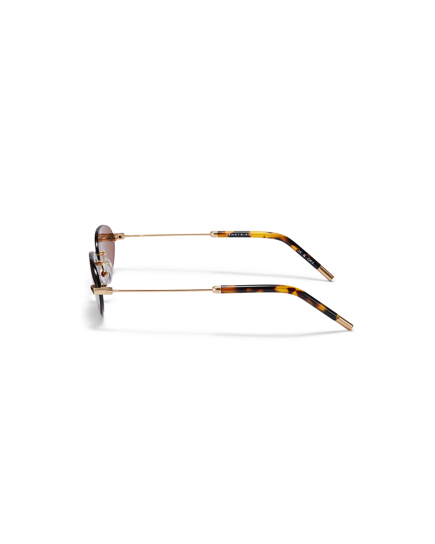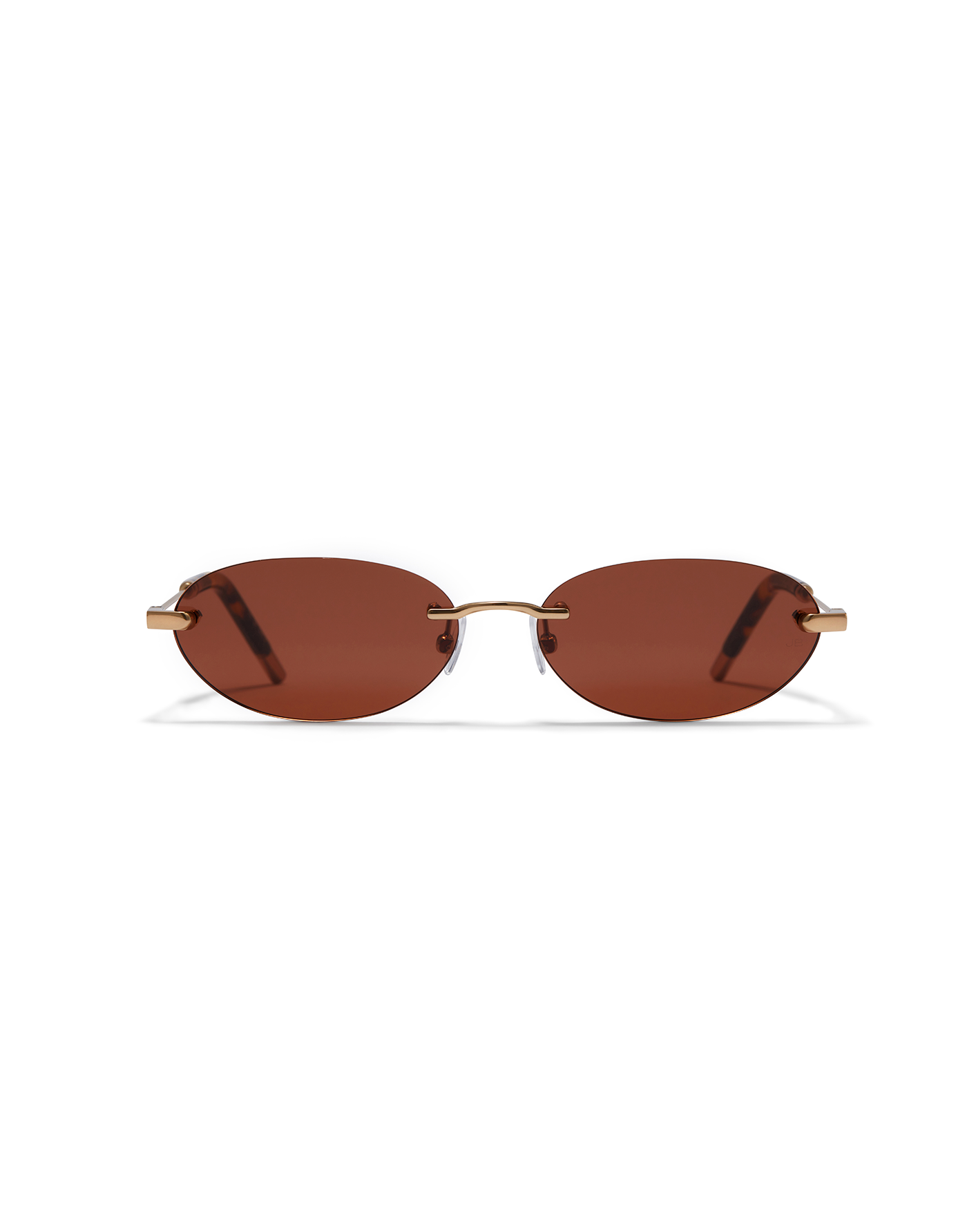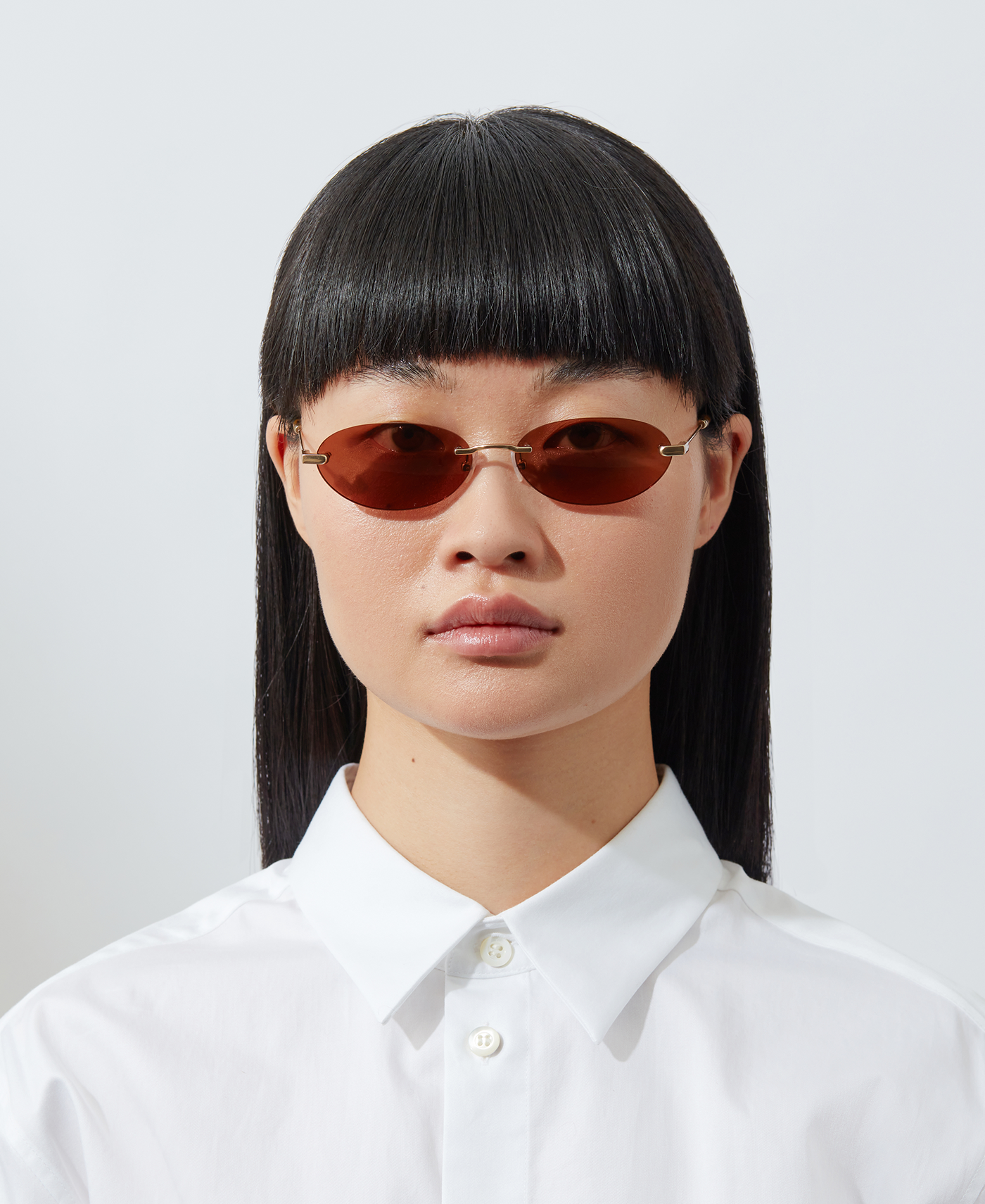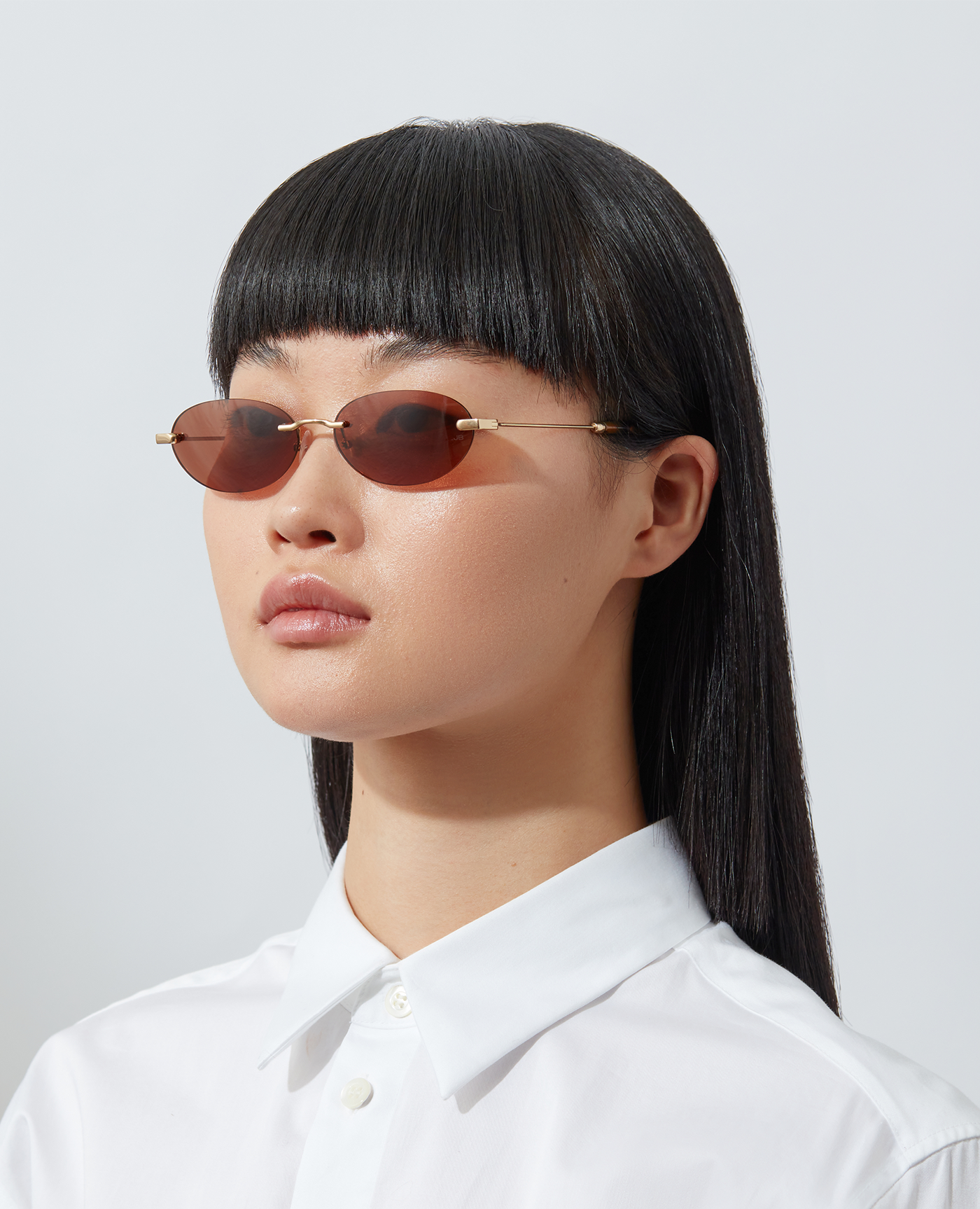 A '90s-inspired oval silhouette with a rimless-structure. These light frames are balanced by fine tubular temples and copper tips.