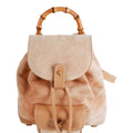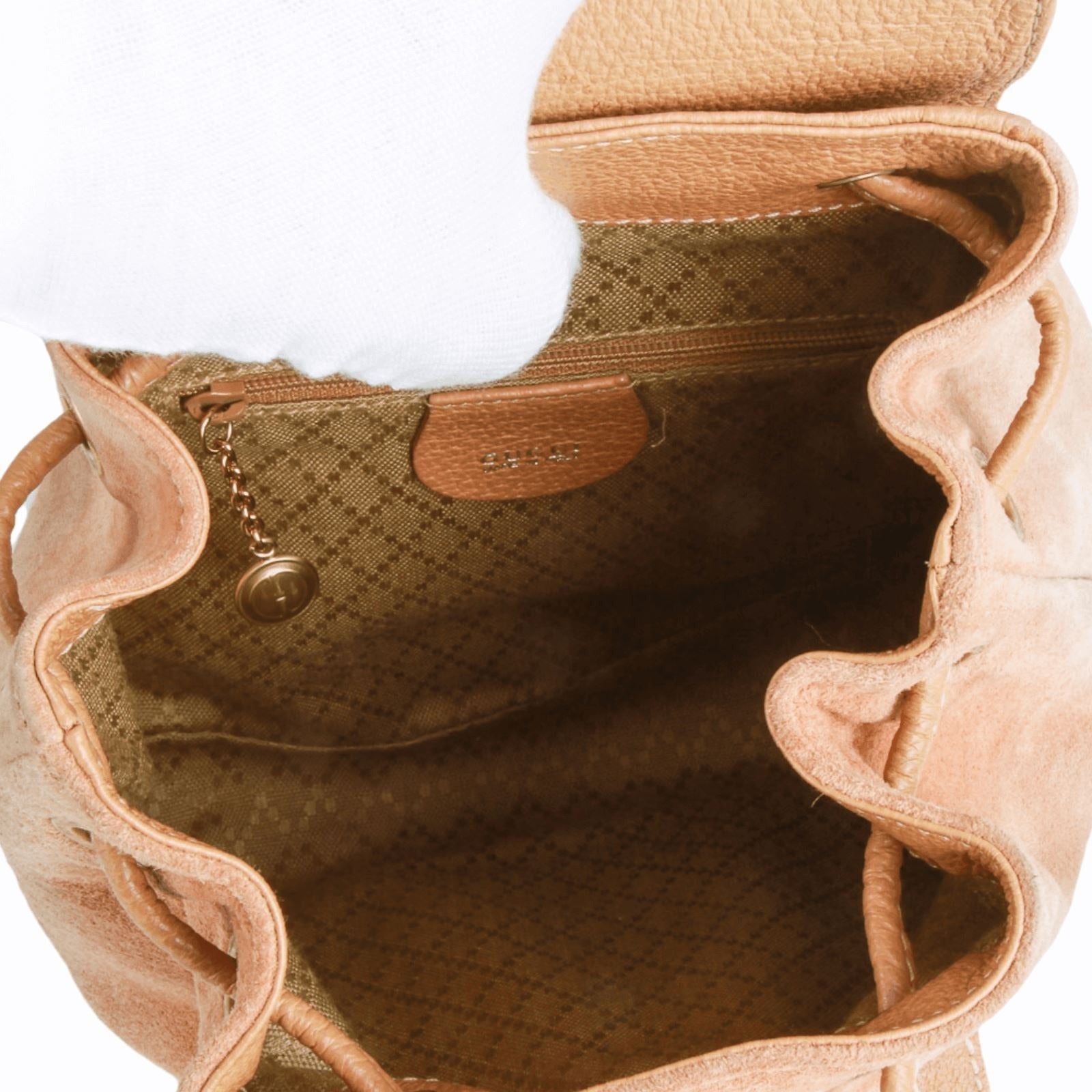 Tom Ford era, Gucci, tan colored, suede and leather, messenger bag/backpack with an exterior pocket, drawstring top, two shoulder strap