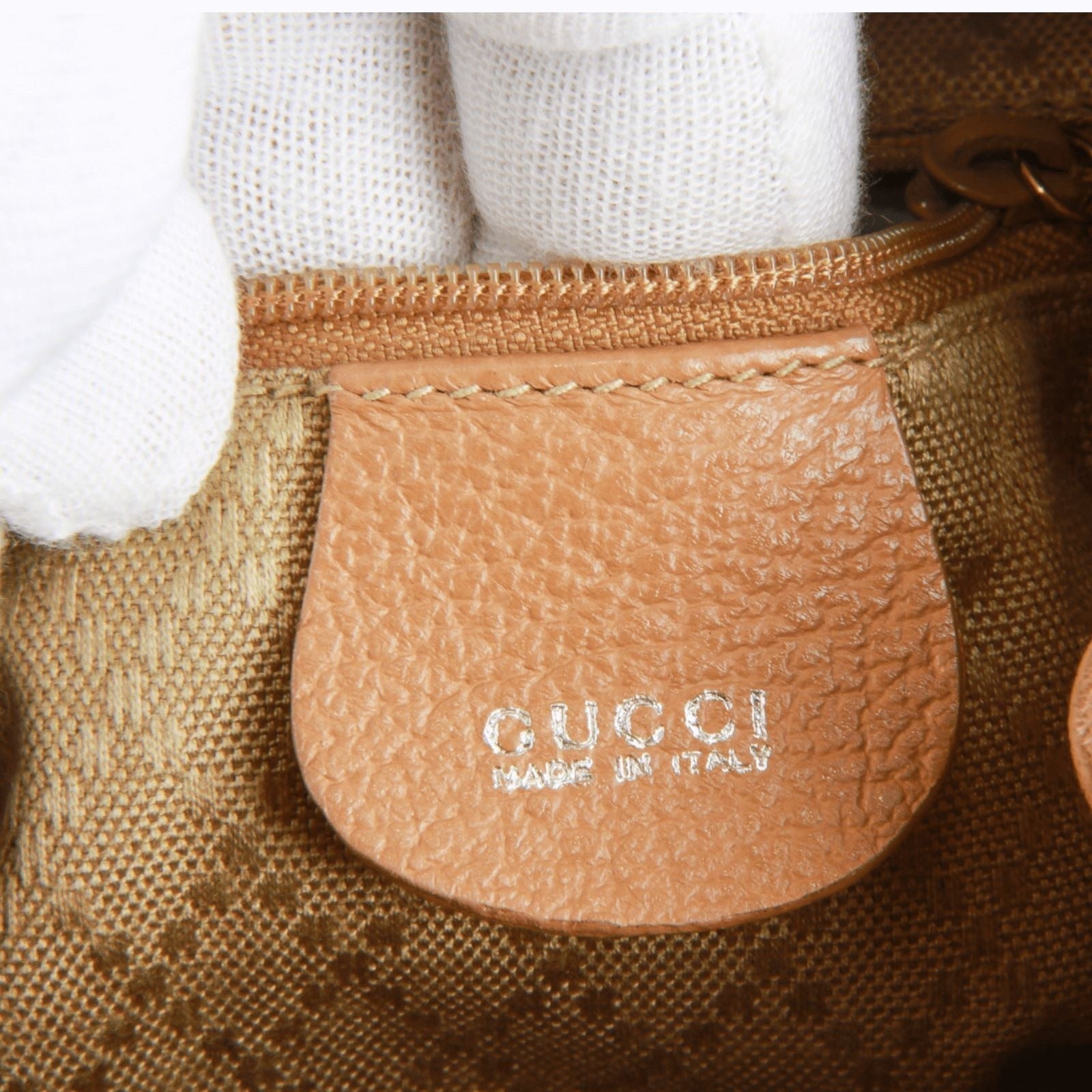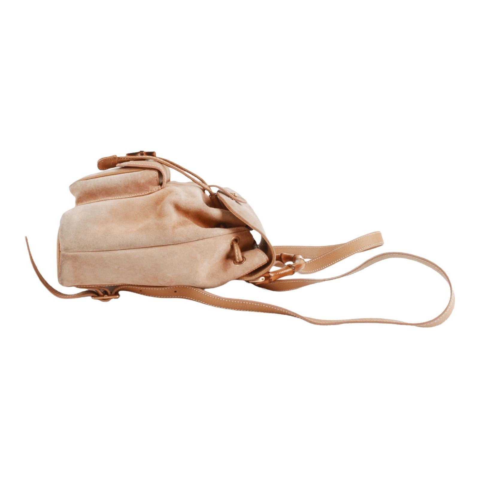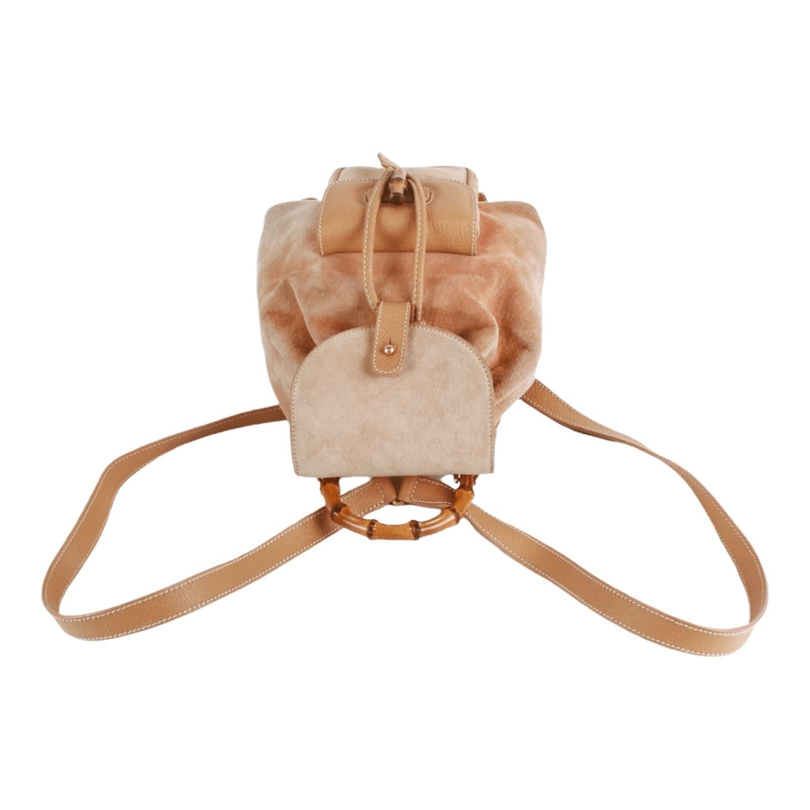The inside is a golden diamond print fabric with gold tone hardware. It has a chic, European style that is timeless. The backpack is, I think, from the late 1990's when Tom Ford was designing for Gucci. It is part of the original 'Bamboo' line of purses and accessories that is still popular today and Gucci recently brought back into their designs. Don't miss out on this stylish piece that you could wear with a dressier outfit, jeans, or a cute summer dress!