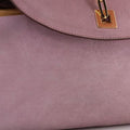 The purse is made of camel colored buttery soft leather and a true pink suede with bold gold accents. The bag is a medium envelope style shoulder purse. There is a heavy gold tiger's head on a chain at the center as a closure- the flap top just folds over and the weight of the tiger's head keeps it closed. It has a leather and gold chain strap that is not adjustable. It also has leather capped corners