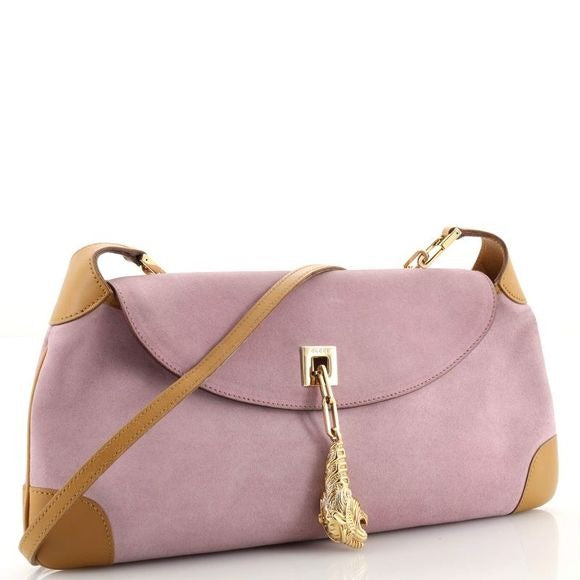 Tom Ford era, RARE, Gucci, tiger charm chain style, camel leather & pink suede purse with a heavy gold tiger's head on a chain clasp