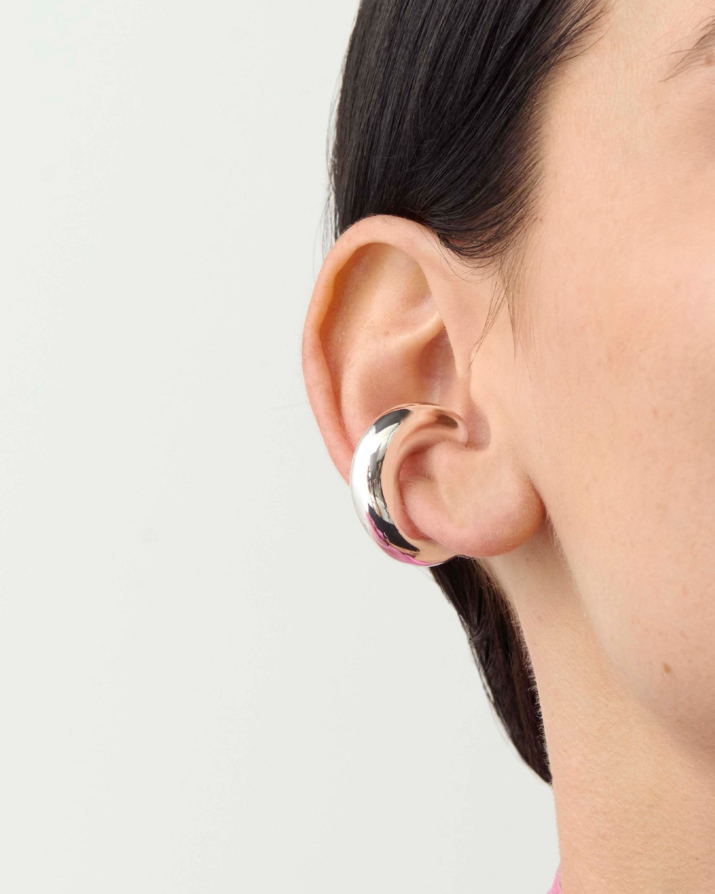 A modern, tubular ear cuff with rounded ends. The Tome Ear Cuff is solid, so you won't be able to squeeze it into place. To wear, position at the thinnest part of your ear, pushing over the edge so it hooks inside. Once it feels secure, wiggle to adjust in place. Finished in high-polish silver.