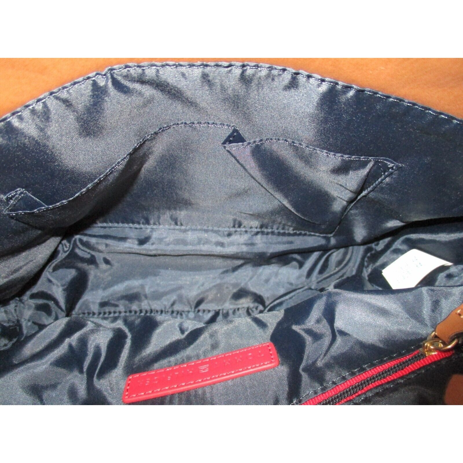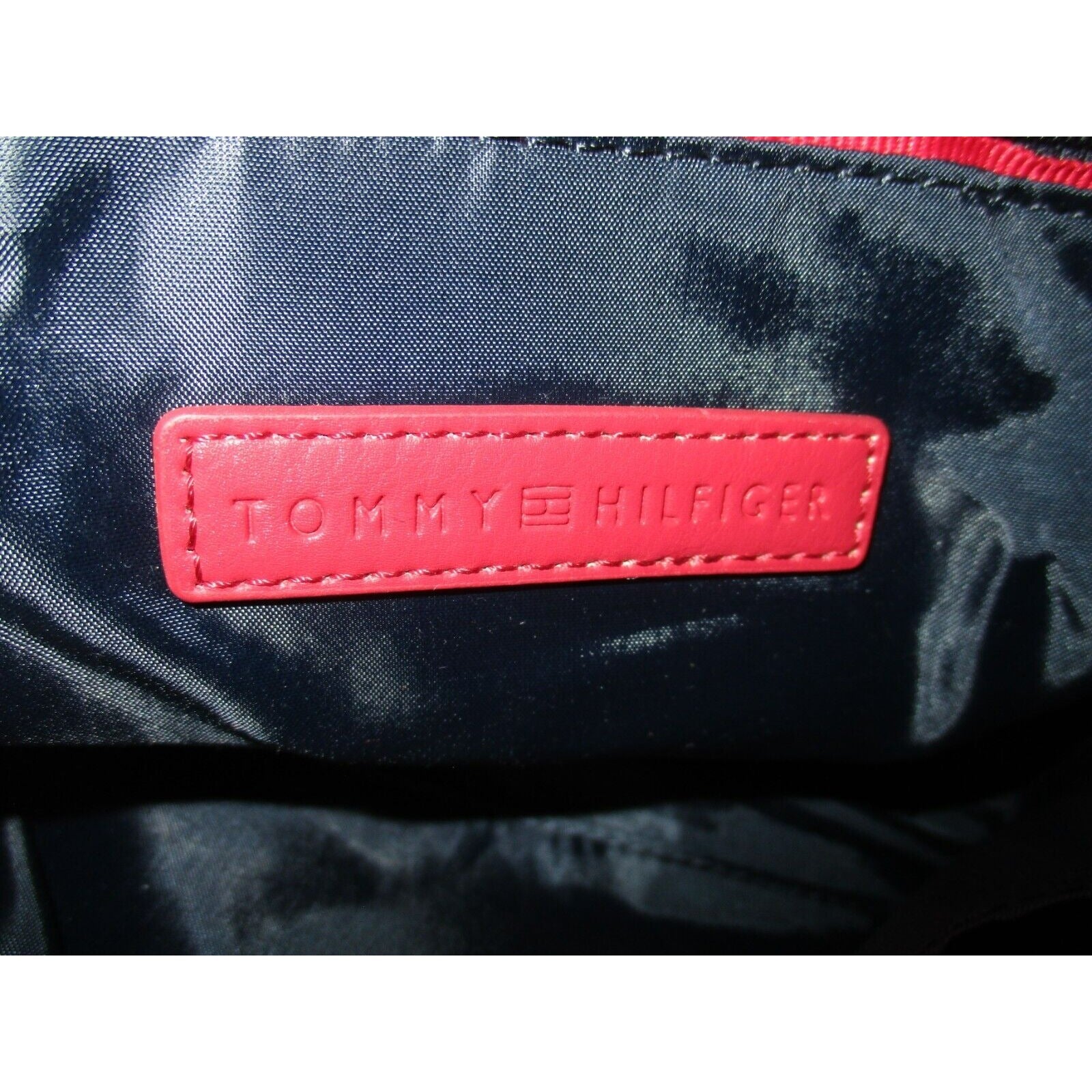 Tommy Hilfiger Classic Tan Canvas Red Logo 2-Way Crossbody Satchel. three full sections with side and zipper compartments. Adjustable 1/2 inch wide leather shoulder strap, 20 inch drop. 9” tall x 8”deep x 4” wide. Perfect for everyday and everywhere use! This 2-way tote easily becomes your 'go to' bag - or, the perfect gift! All measurements are approximate.