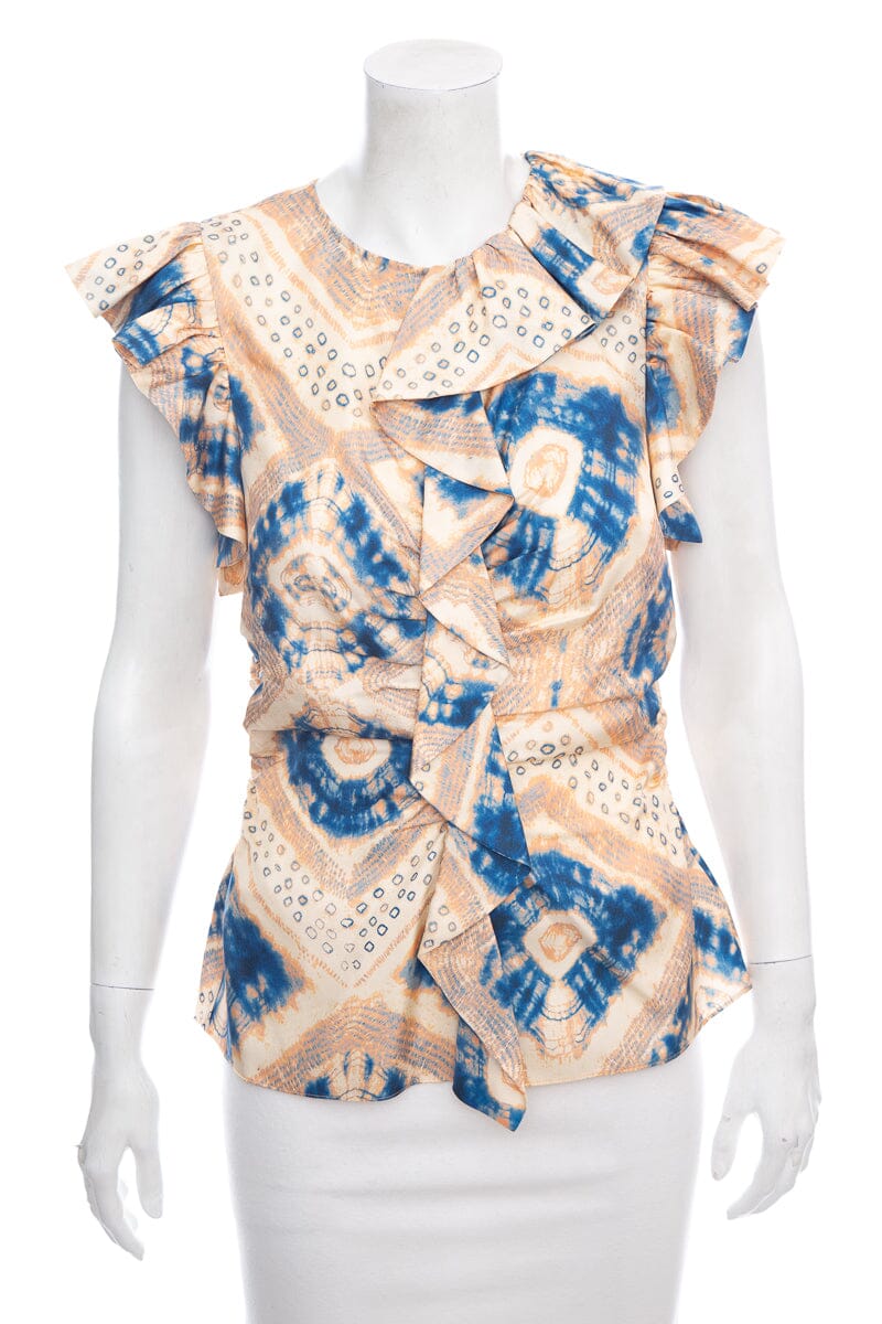 Ulla Johnson Beige & Blue Silk Ruffle Printed Blouse SZ 4
