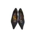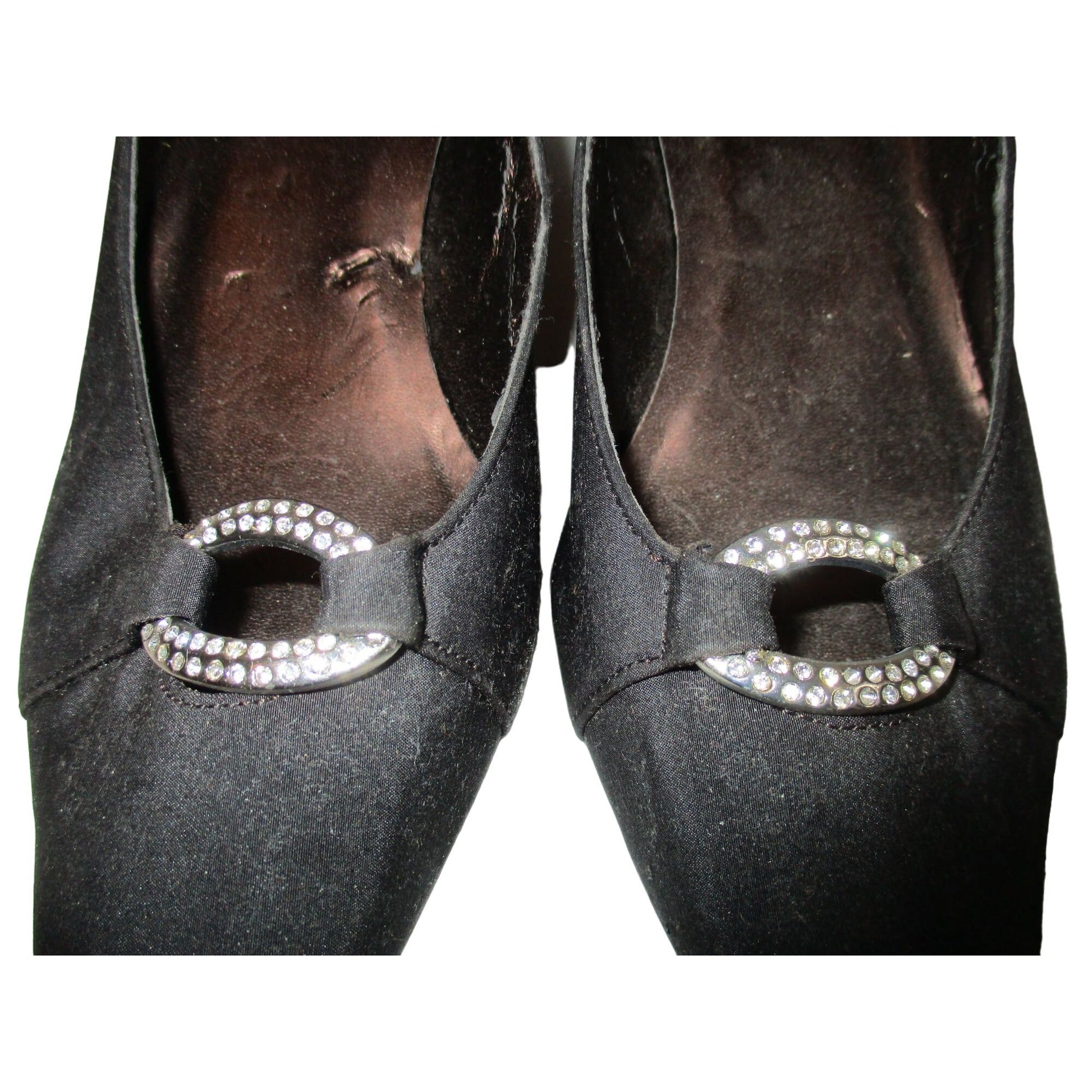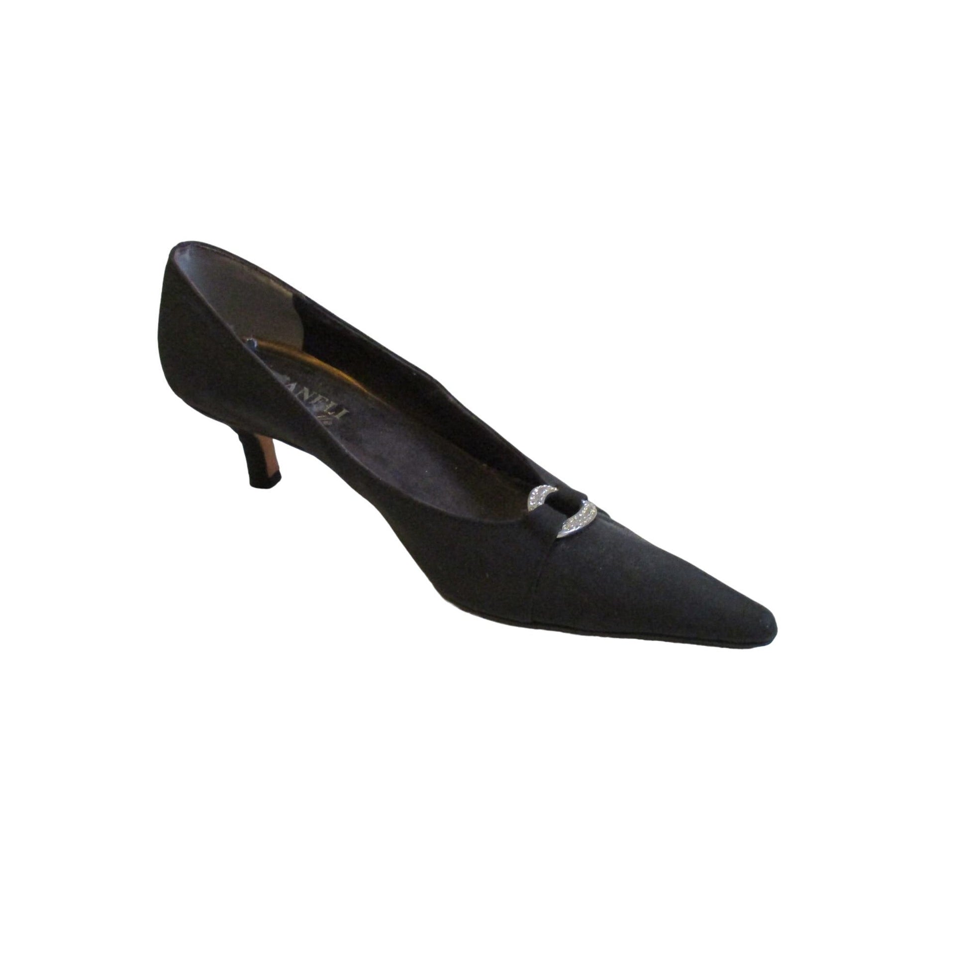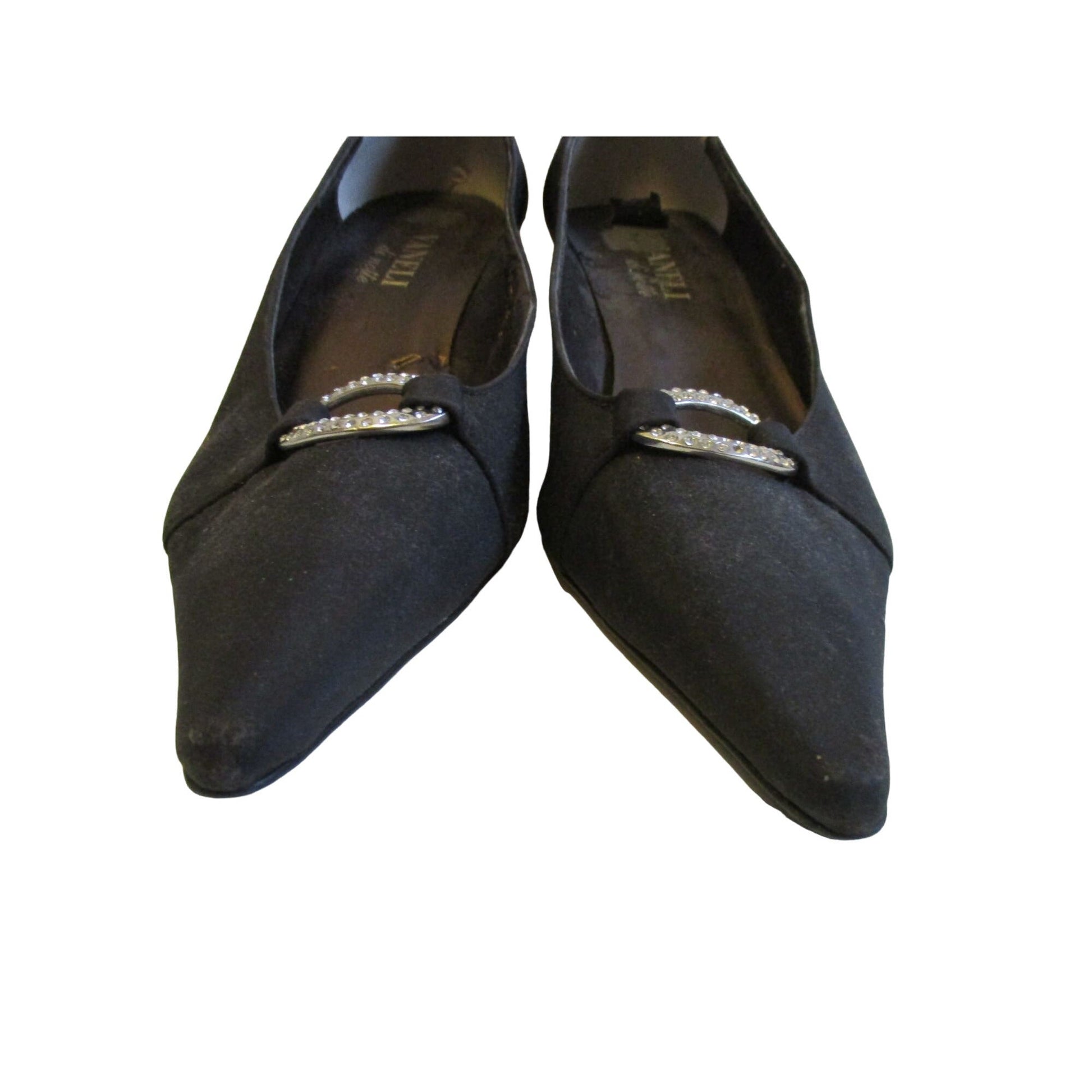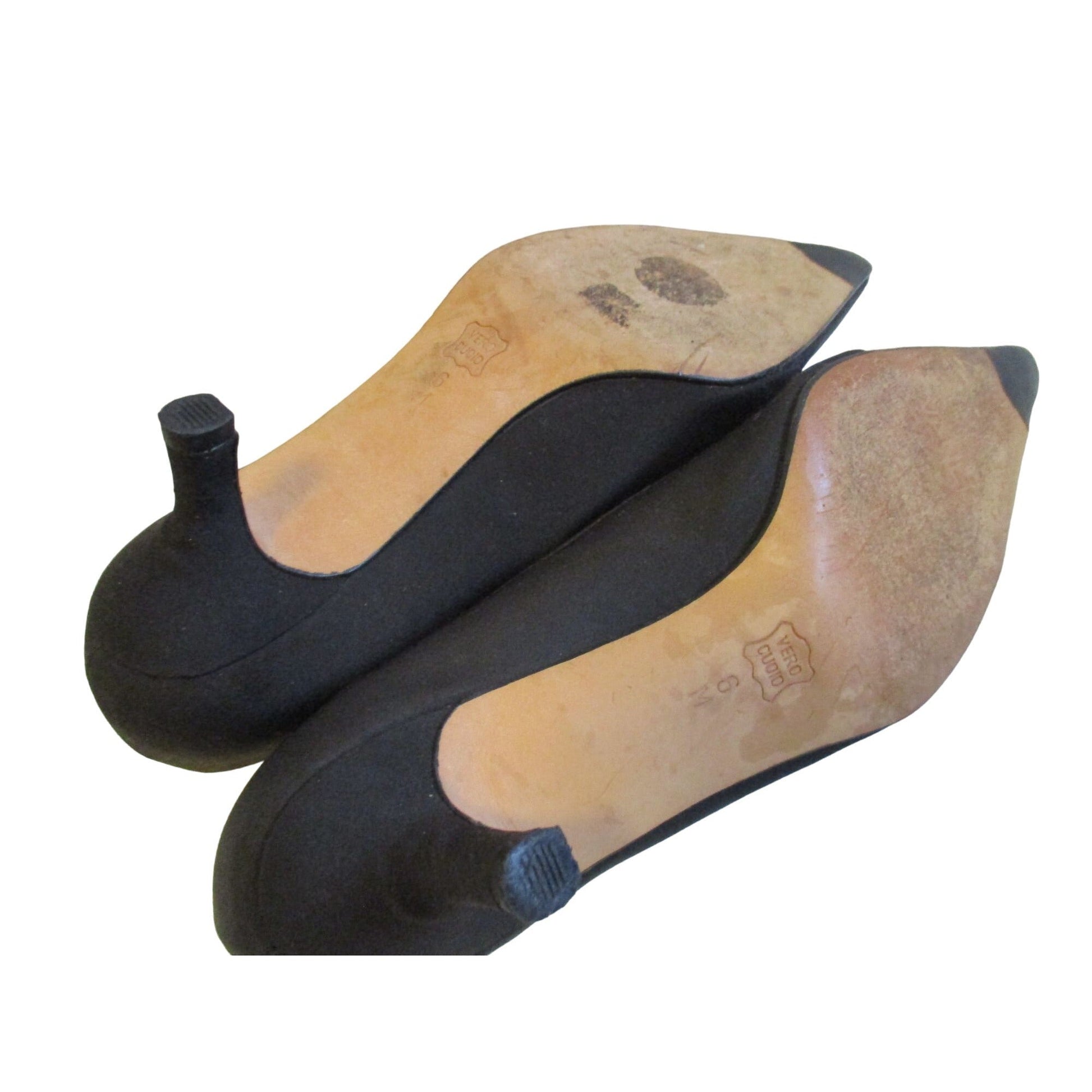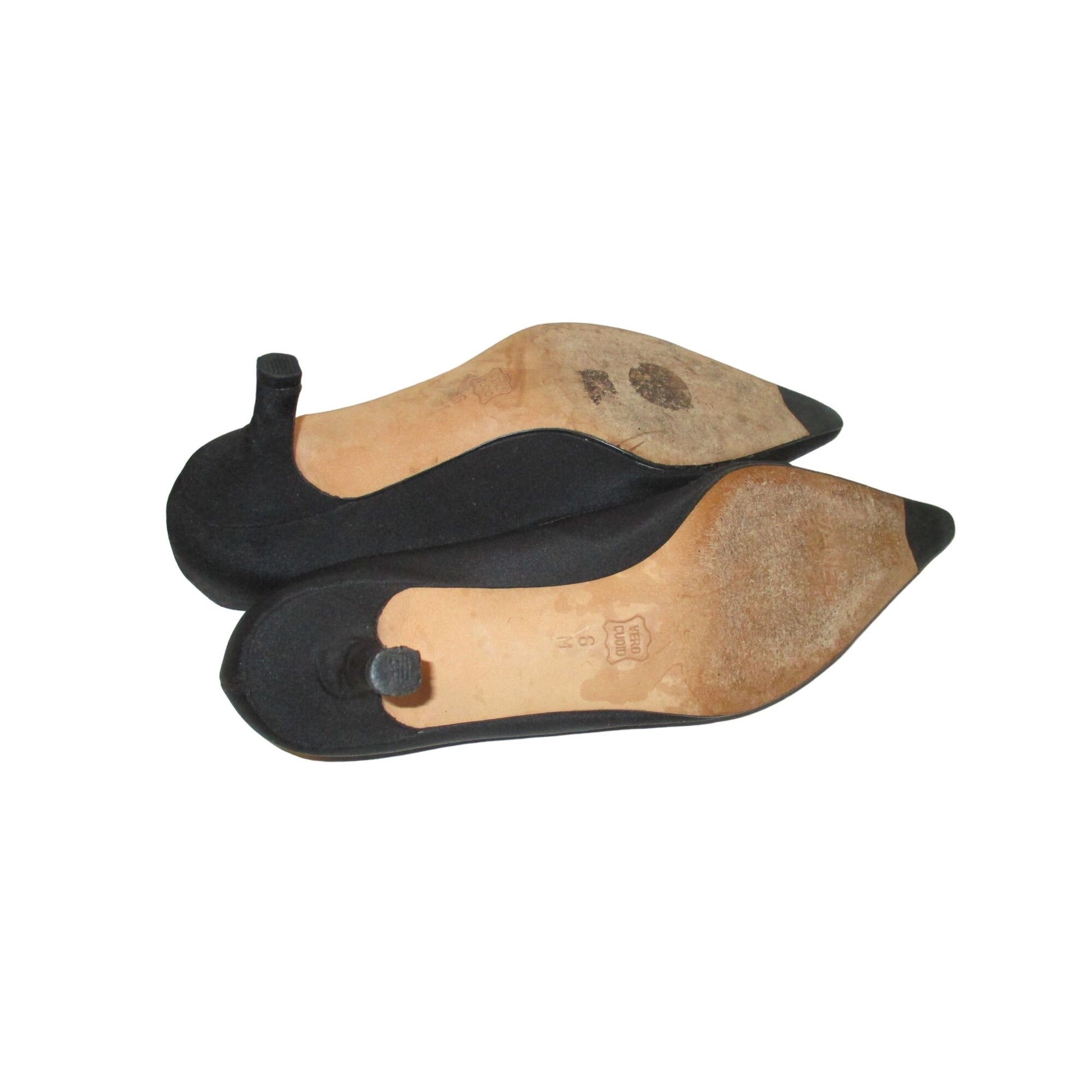 Vintage Vaneli di notte Black Peau de Soie Pumps. Size 6M. 2" Kitten Heel. Pointed Toe with Rhinestone Accent Vamp. All measurements are approximate. Dings, lifting to insoles. Missing rhinestones. Please see photos for more details. 1023 (S20-12)