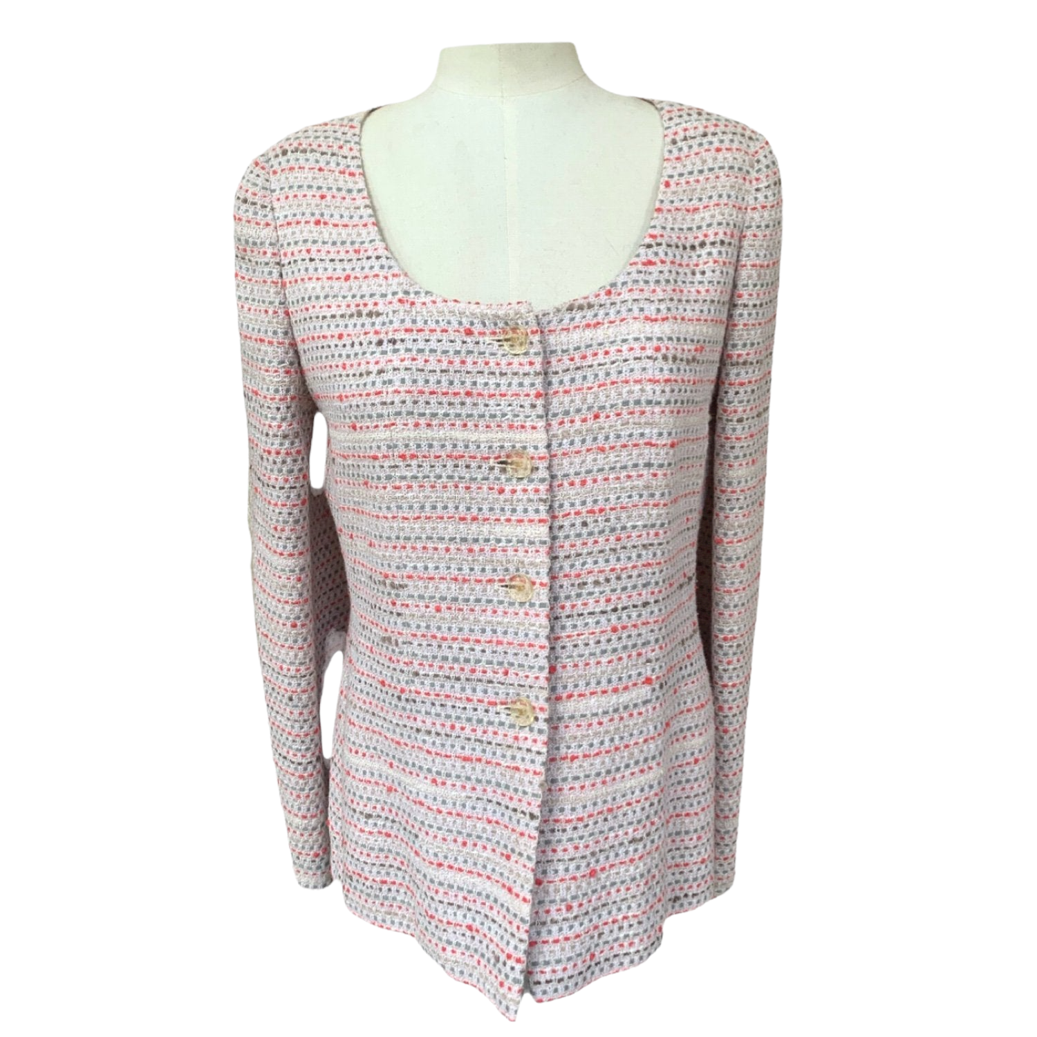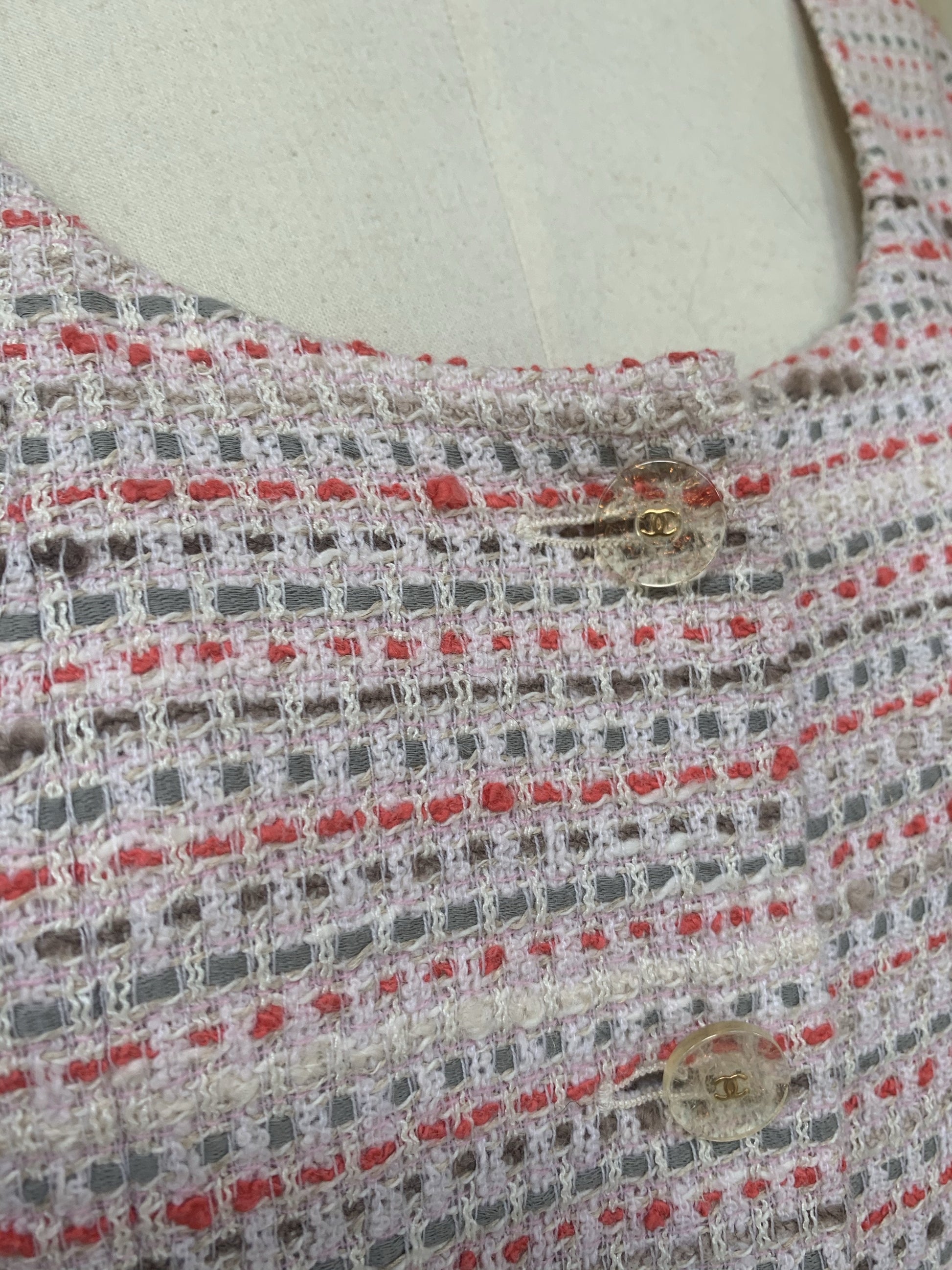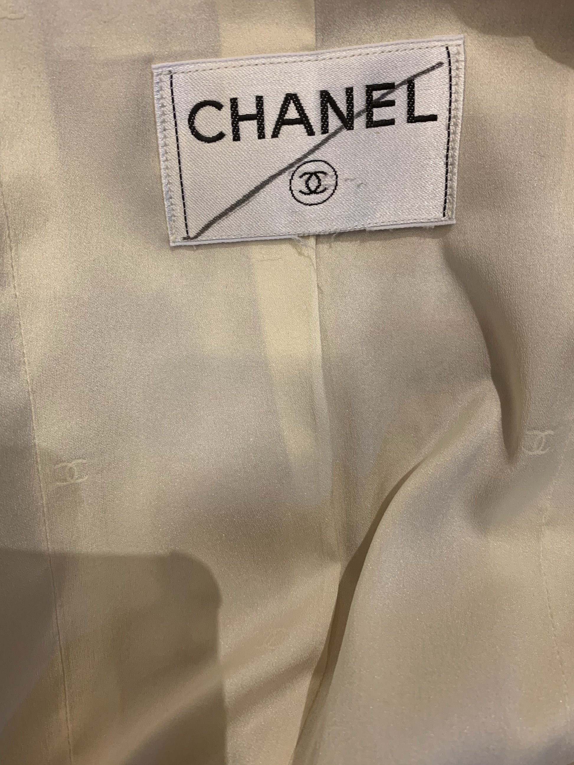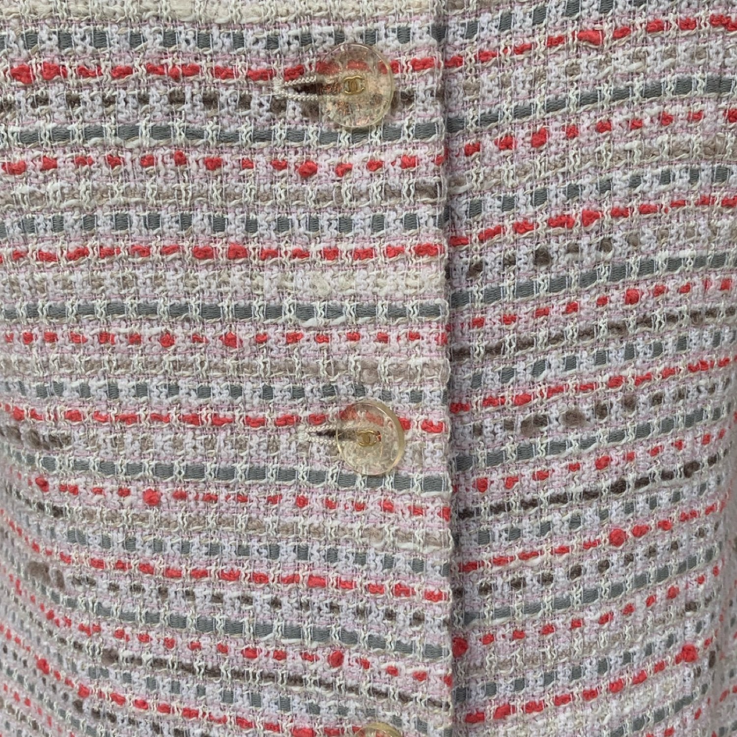 � DESCRIPTION: Chanel suit -�Opening with transparent resin buttons with gold details and CC logo