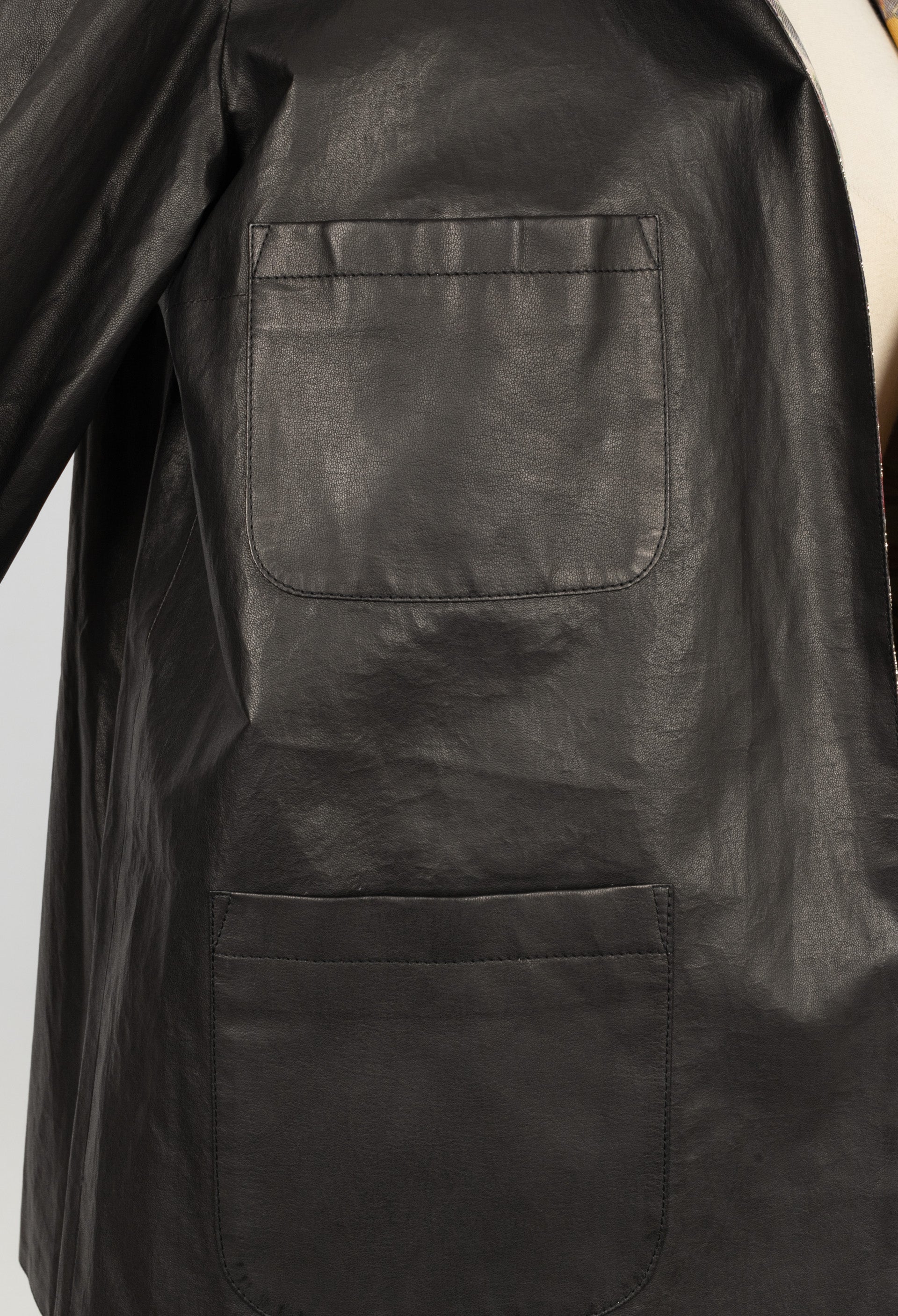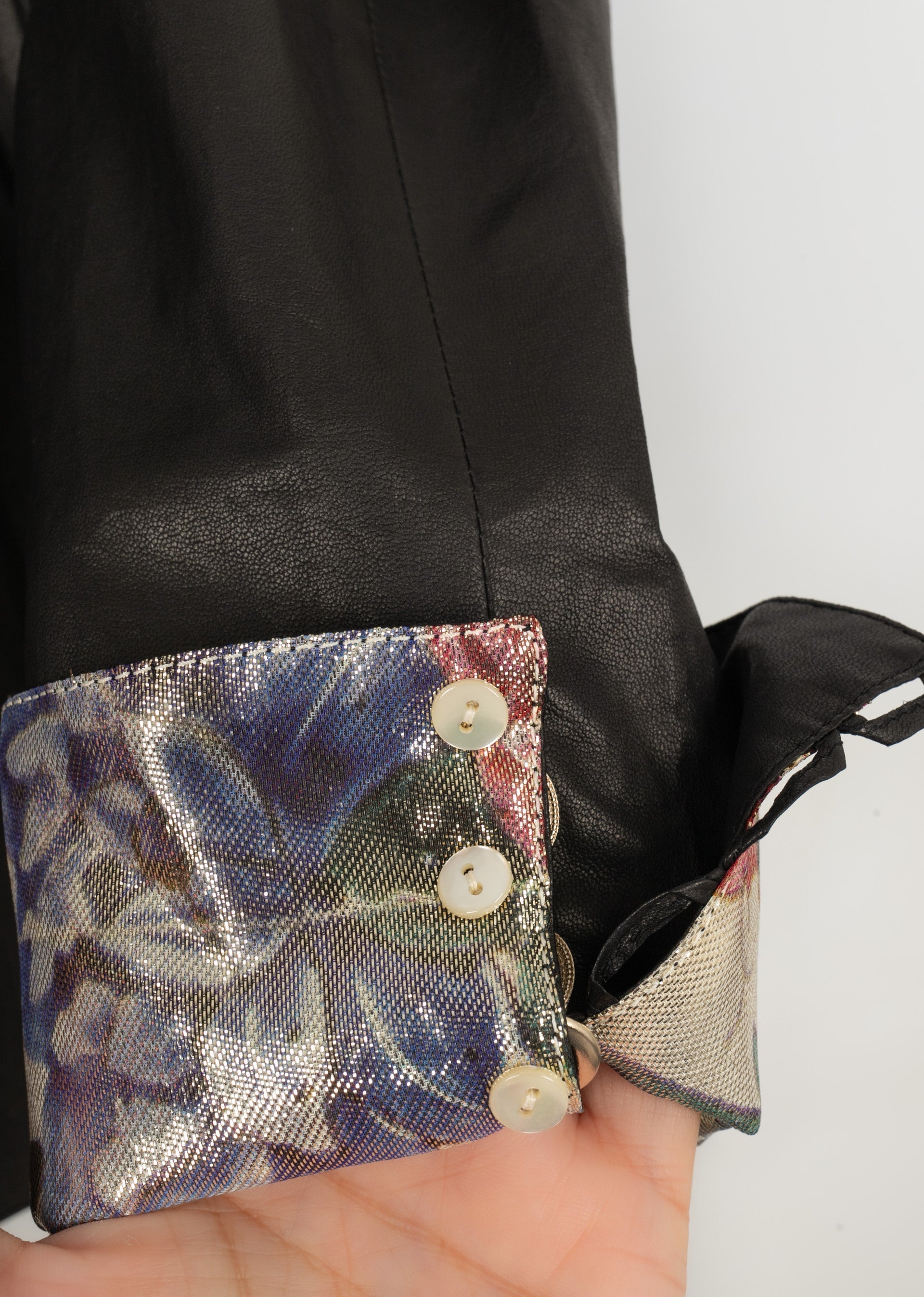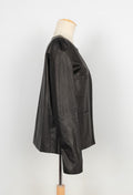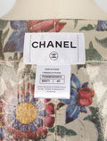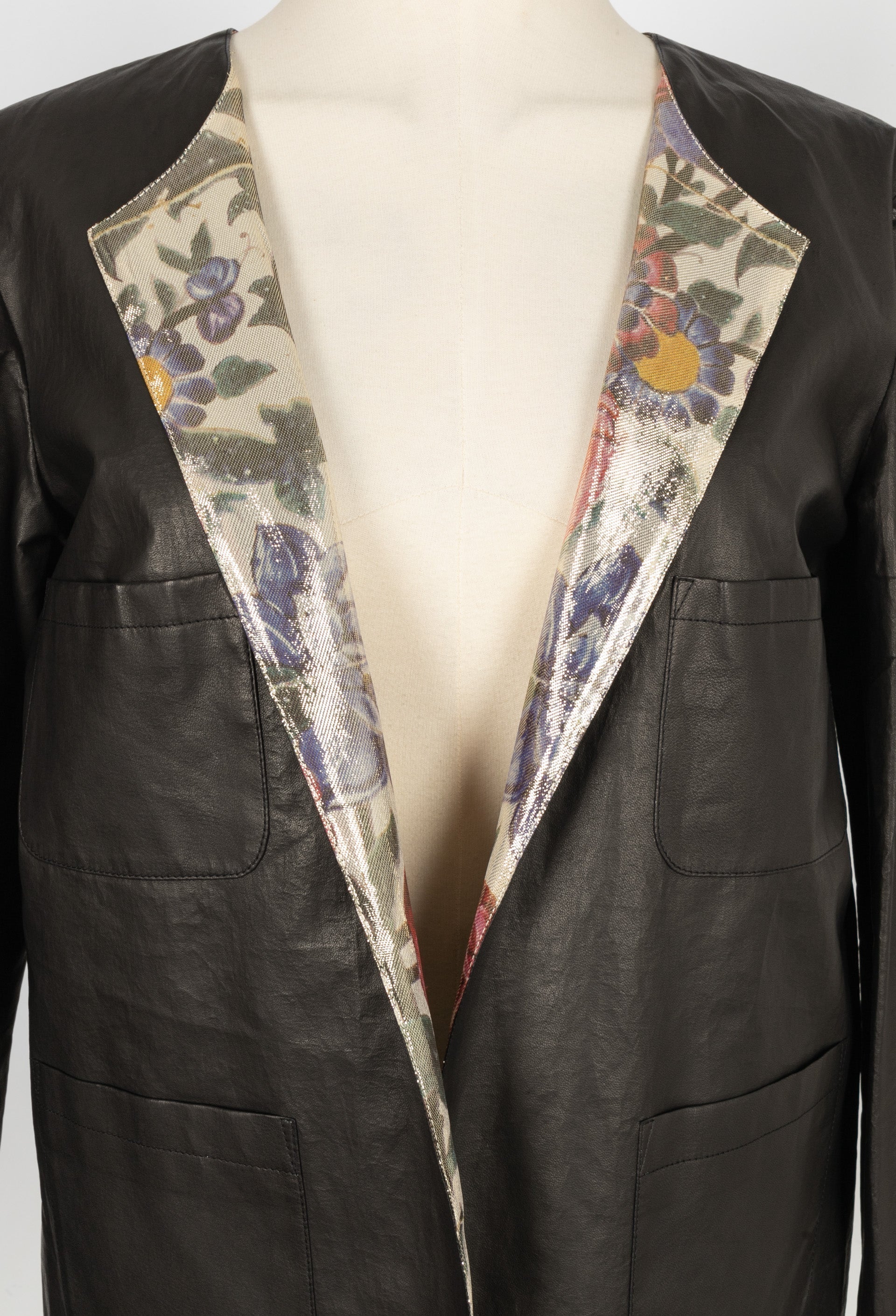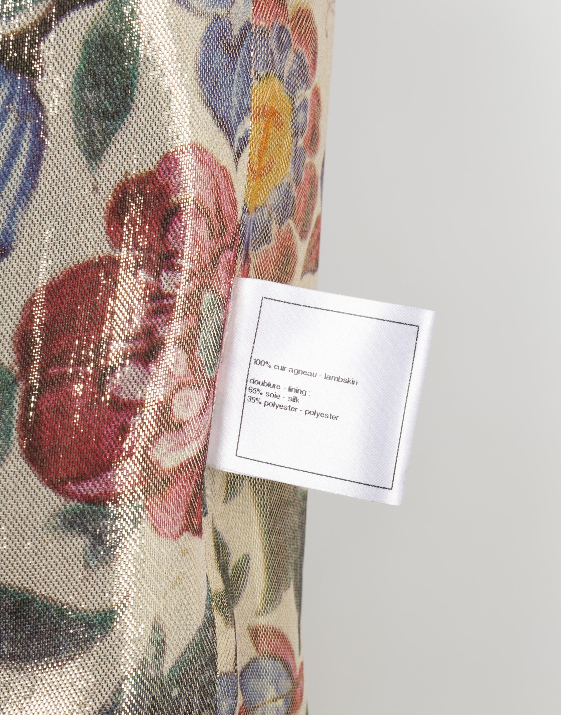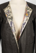 CHANEL - (Made in France) Veste en cuir d'agneau et doublure en lamé imprimée de fleurs. Taille 40FR.