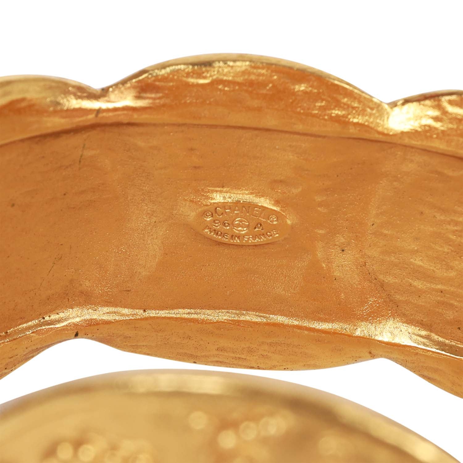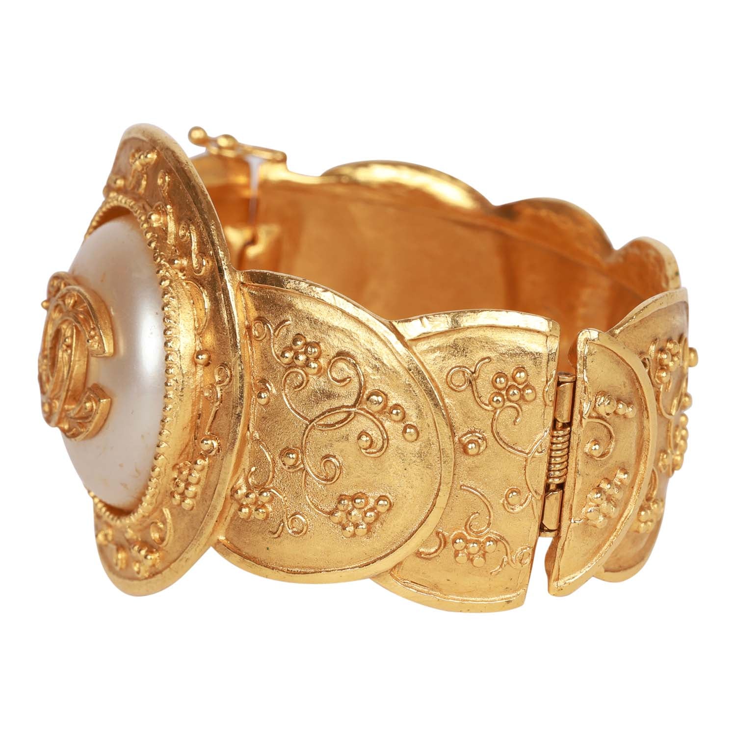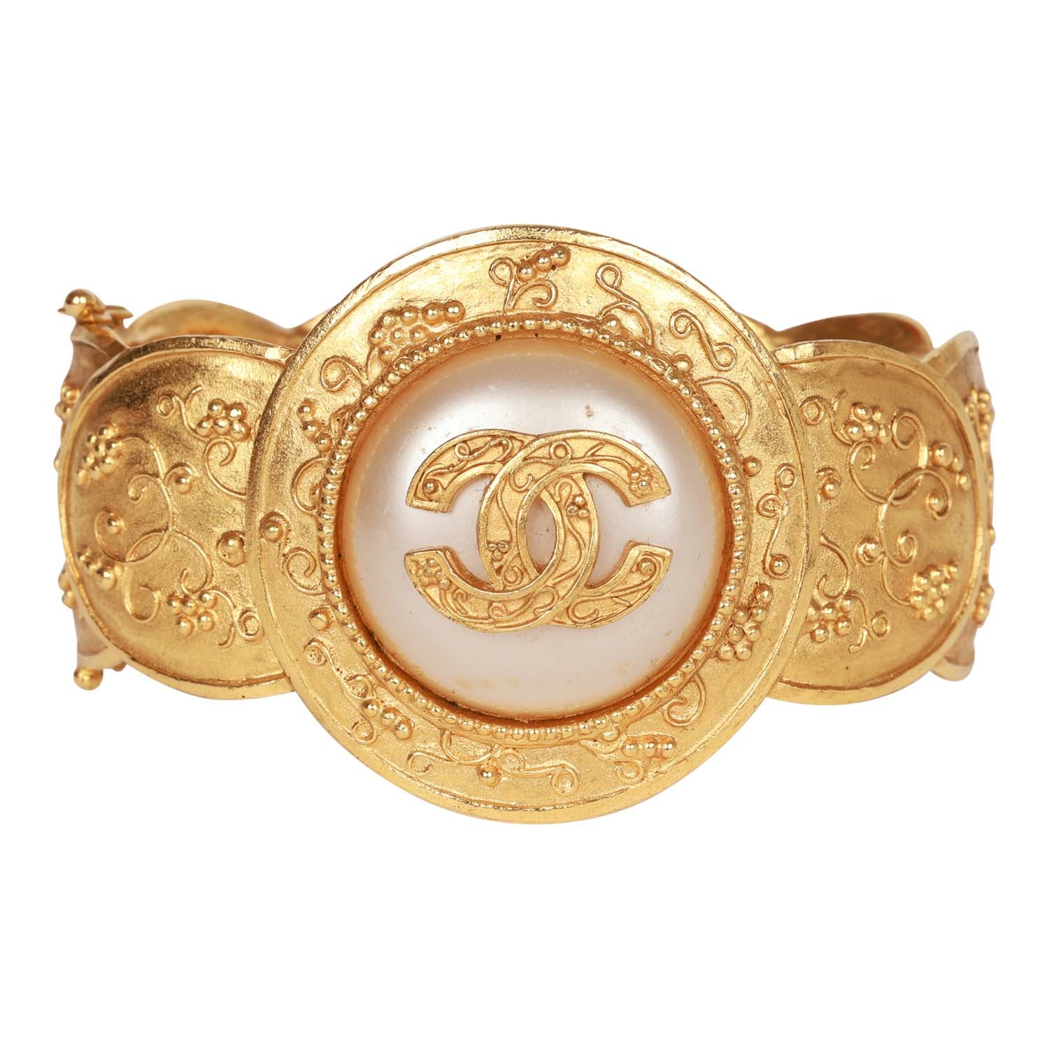 This vintage 1996 bracelet is in textured gold tone metal with a CC logo over a faux pearl and a hinge clasp bangle closure.