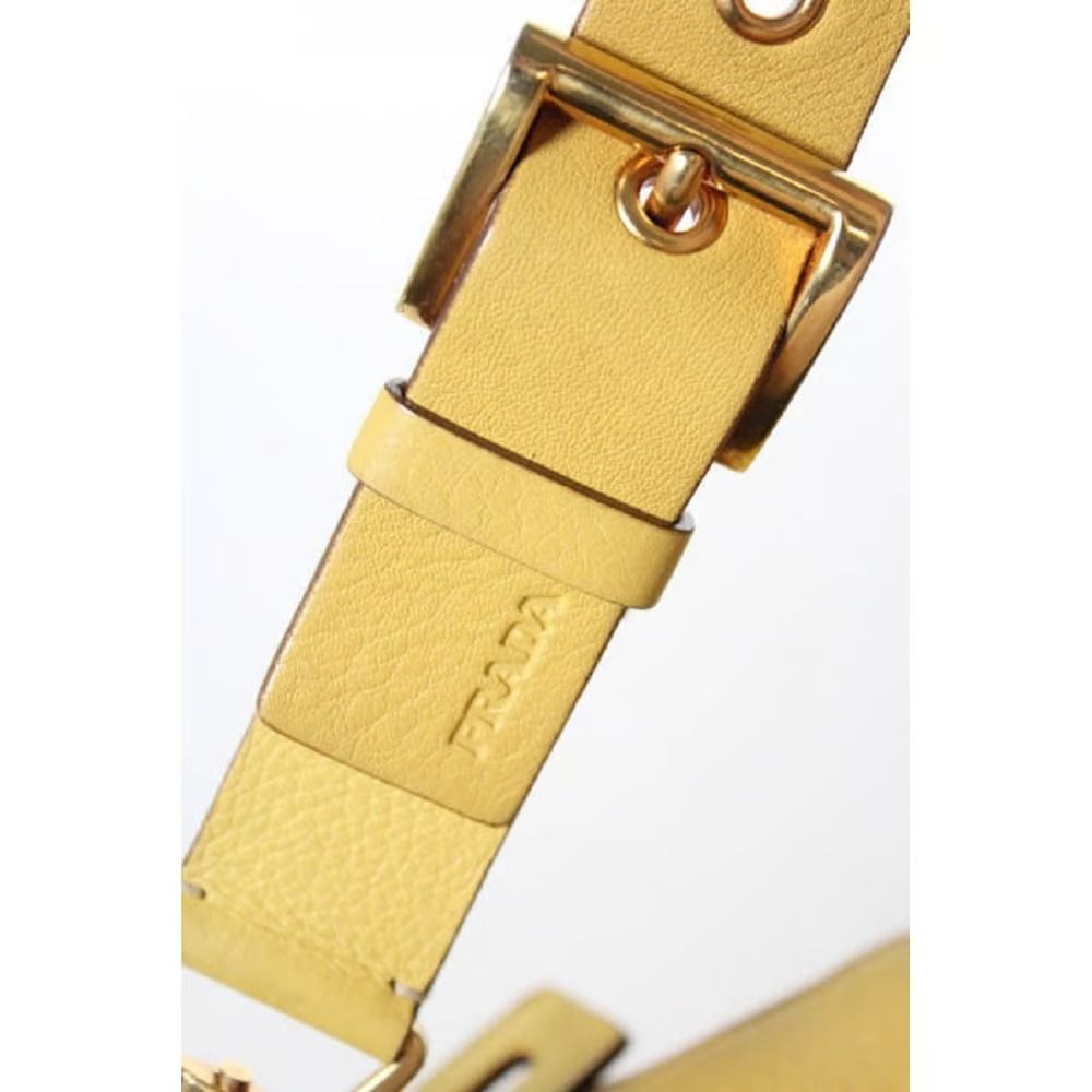 The bag is a satchel-shaped, single-strap, hobo-style shoulder bag by Italian designer Prada from the 1990s. It is made from pale yellow textured leather and buttery smooth with bold gold hardware. It has a top zip closure with a wide adjustable strap and the original padlock and keys! The interior is very clean with an interior zip pocket.
