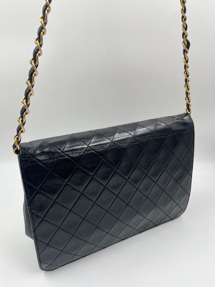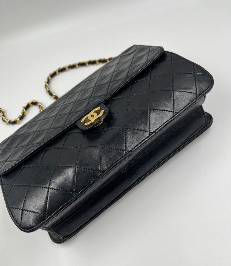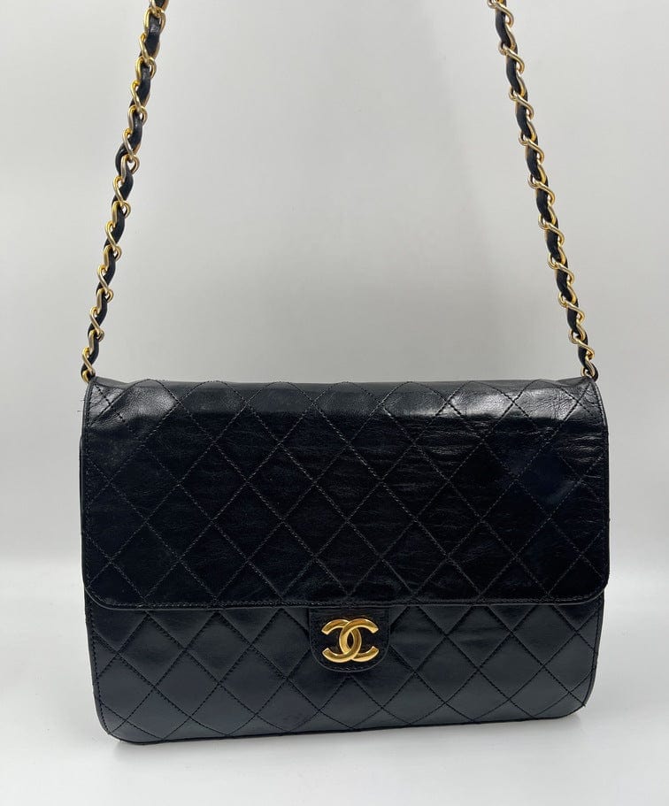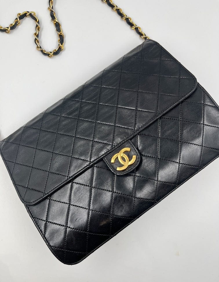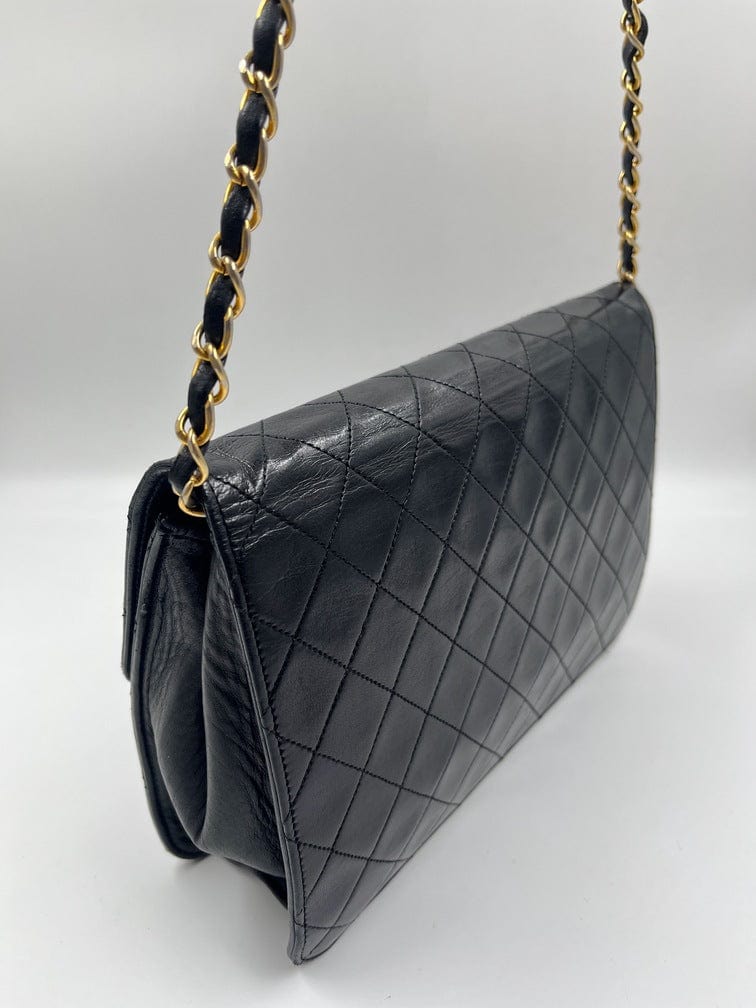A beautiful vintage Chanel Flap shoulder bag. The quilted black lambskin leather is silky soft. The gold hardware is also in good condition, with minor signs of wear.