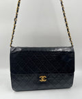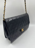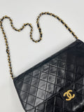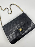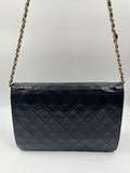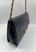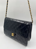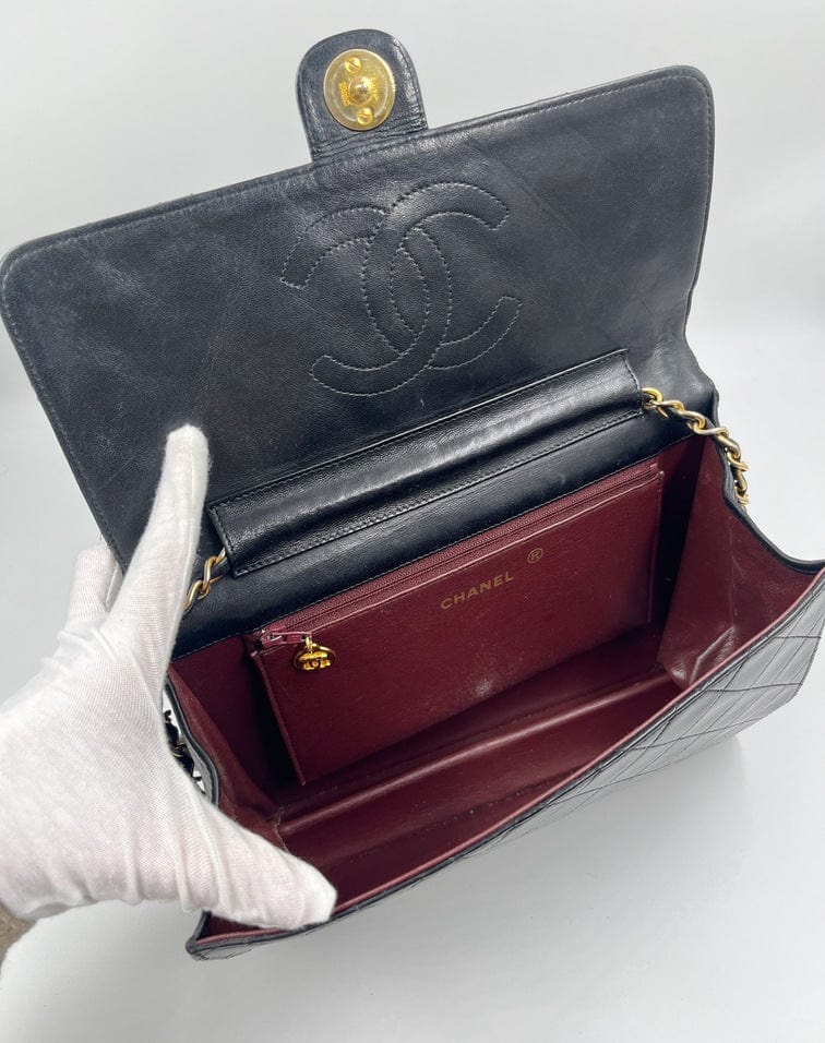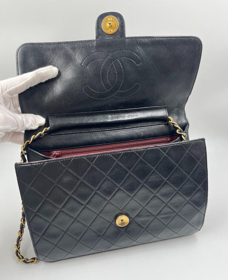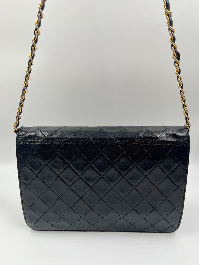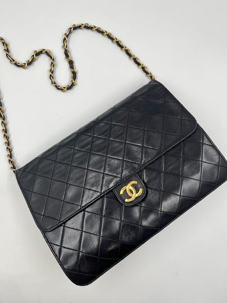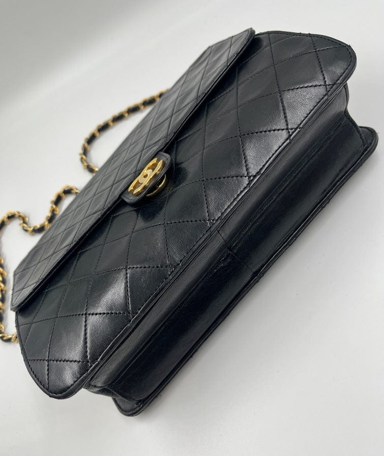 A beautiful vintage Chanel Flap shoulder bag. The quilted black lambskin leather is silky soft. The gold hardware is also in good condition, with minor signs of wear.