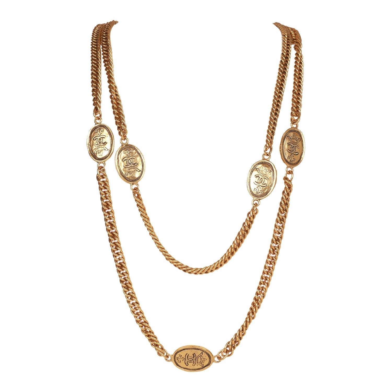 This vintage Chanel necklace is in 24K gold plated metal and features ten CC decorative oval coins on a long woven chain link meant to be doubled.