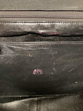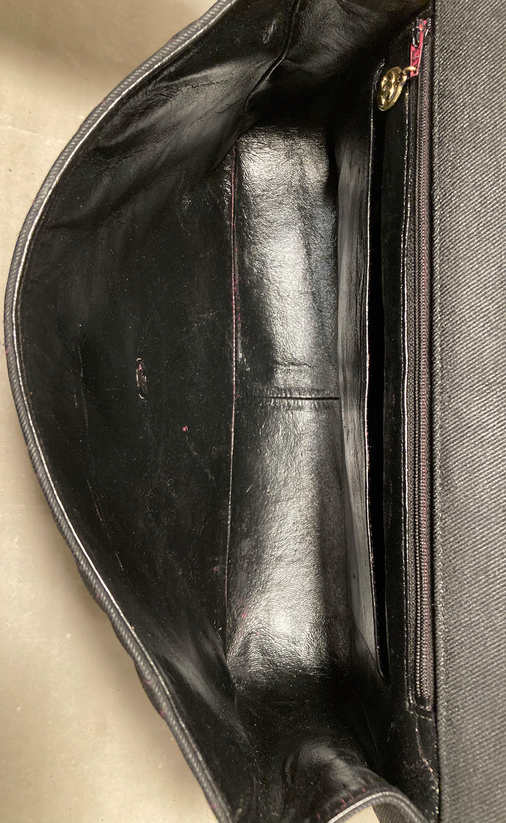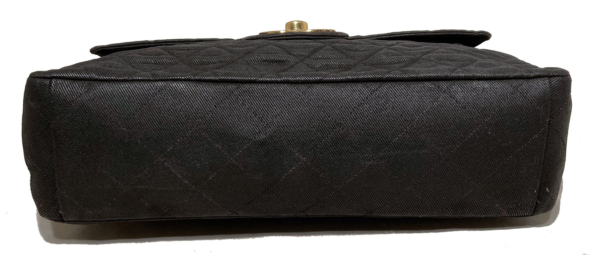 Chanel Black Denim Maxi Classic Flap Shoulder Bag in very good condition. Quilted black denim exterior trimmed with gold hardware. Front CC logo twist closure opens via single flap to a black leather interior with one slit and one zipped side pockets. Light wear throughout consistent with age and use. Small areas of red discoloration on exterior and a few spots/marks on lining. Please see photos for details. Purchase includes a dust cover. Measurements: 13.25"x9.5"x3.75"� 13.5-24" strap drop
