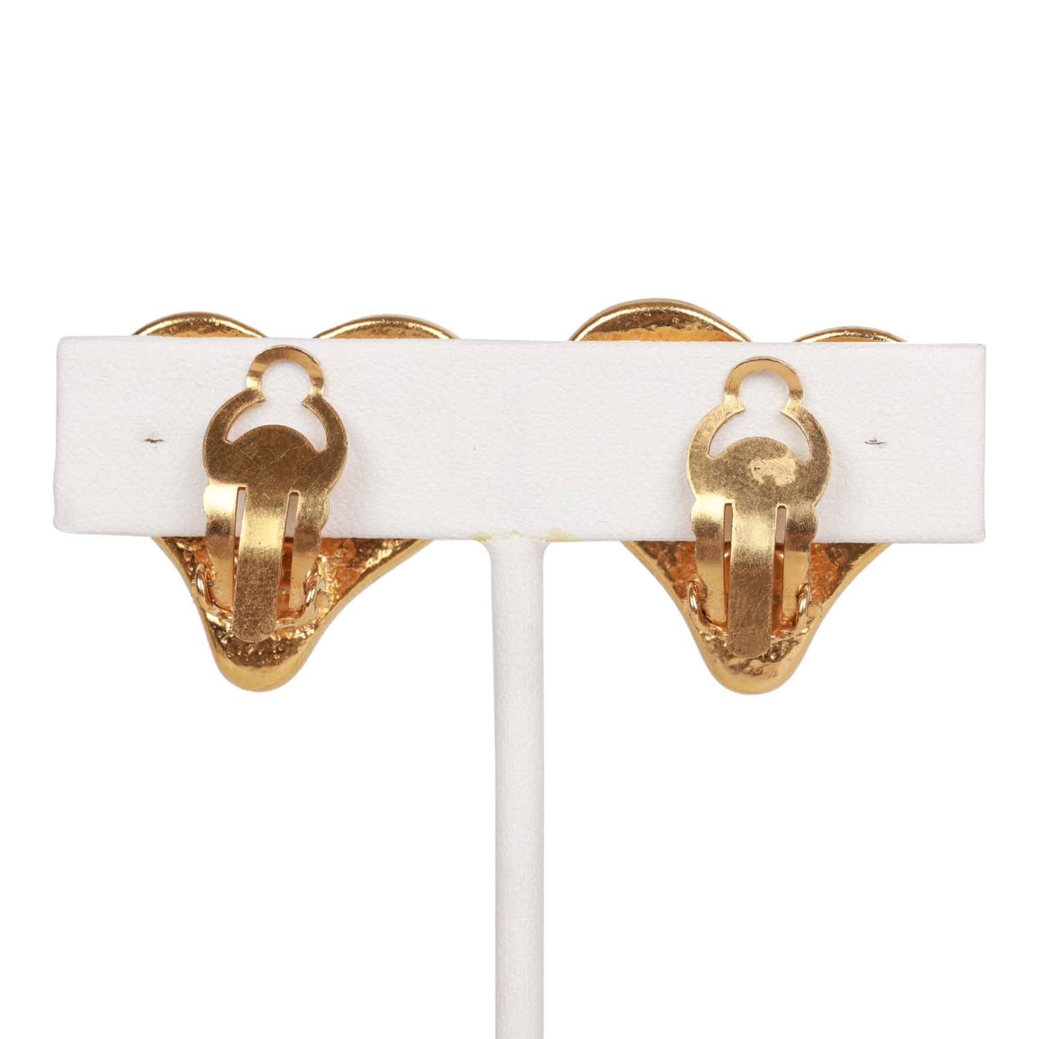 These Vintage 95P Chanel Blue Gripoix Heart earrings are in gold tone metal with the signature CC logo design and a clip on closure.