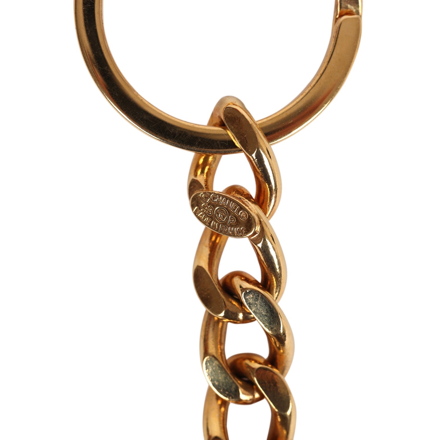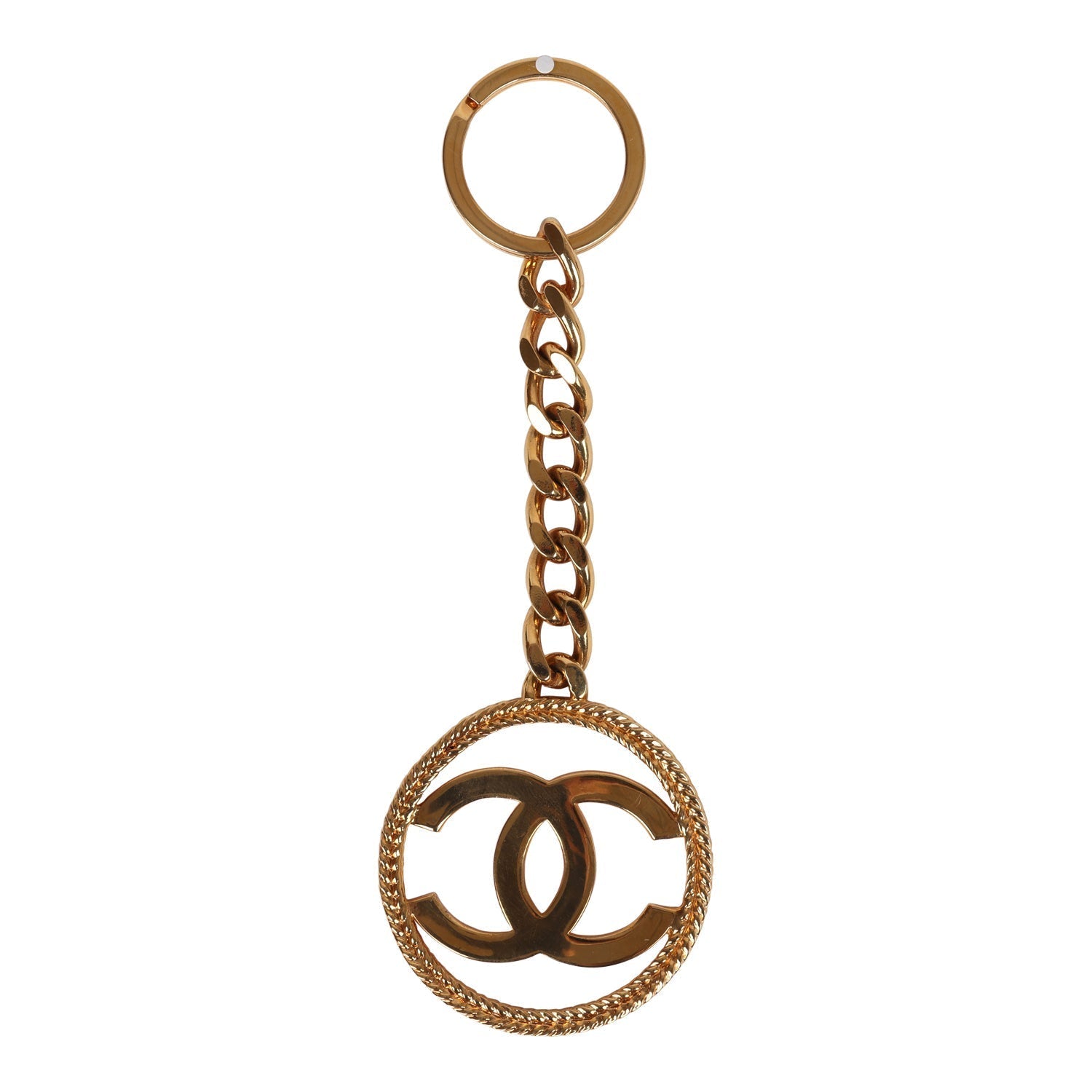 This 1993 vintage Chanel CC in circle keychain with 24K gold plated hardware features a CC motif inside a circle key chain.