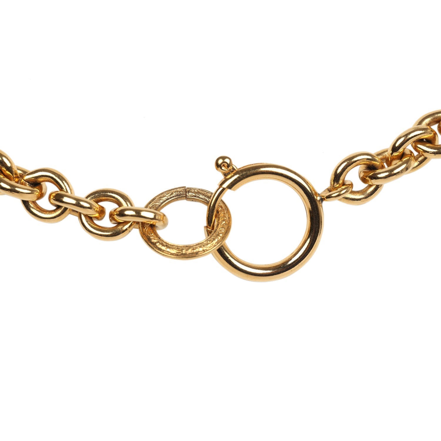 This 1993 Vintage Chanel quilted oval CC pendant necklace has gold tone hardware, features a quilted engraved interlocking 'CC' oval logo pendant and an O-ring clasp closure.