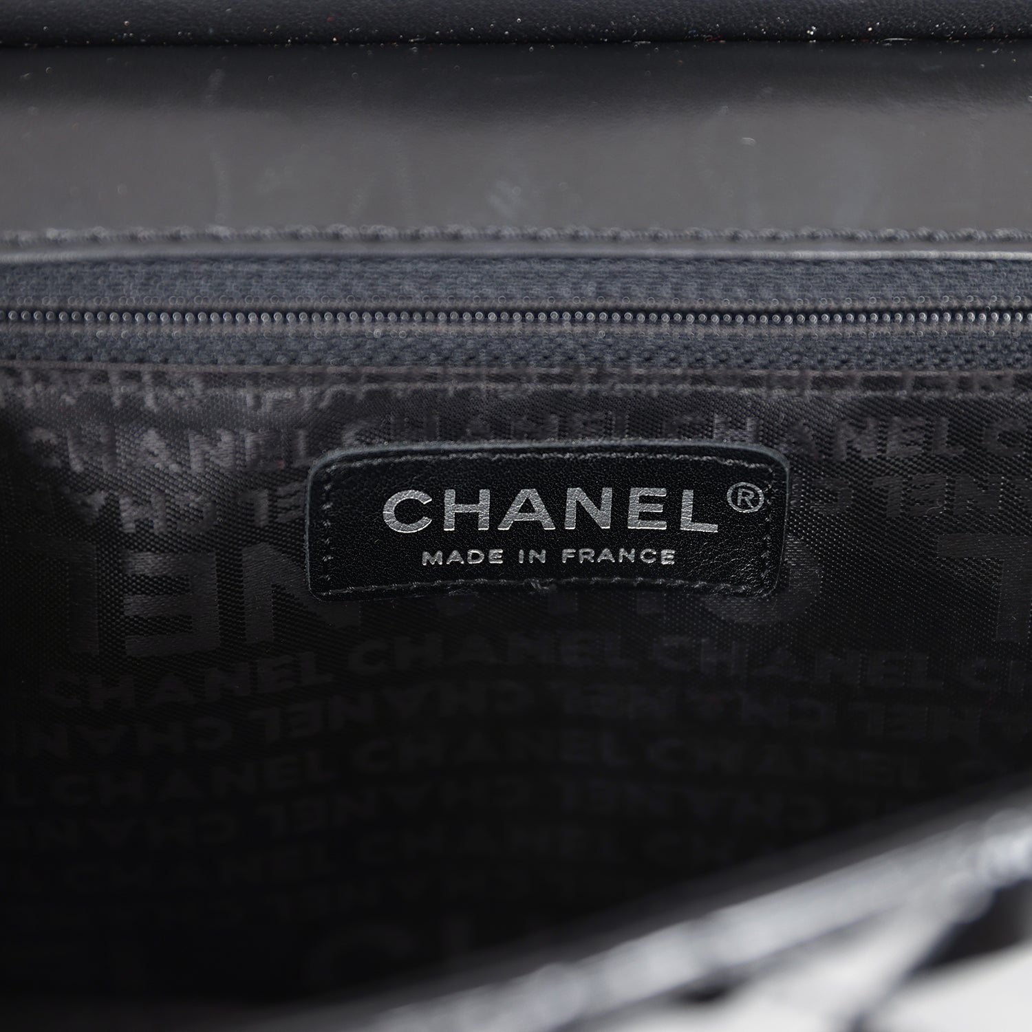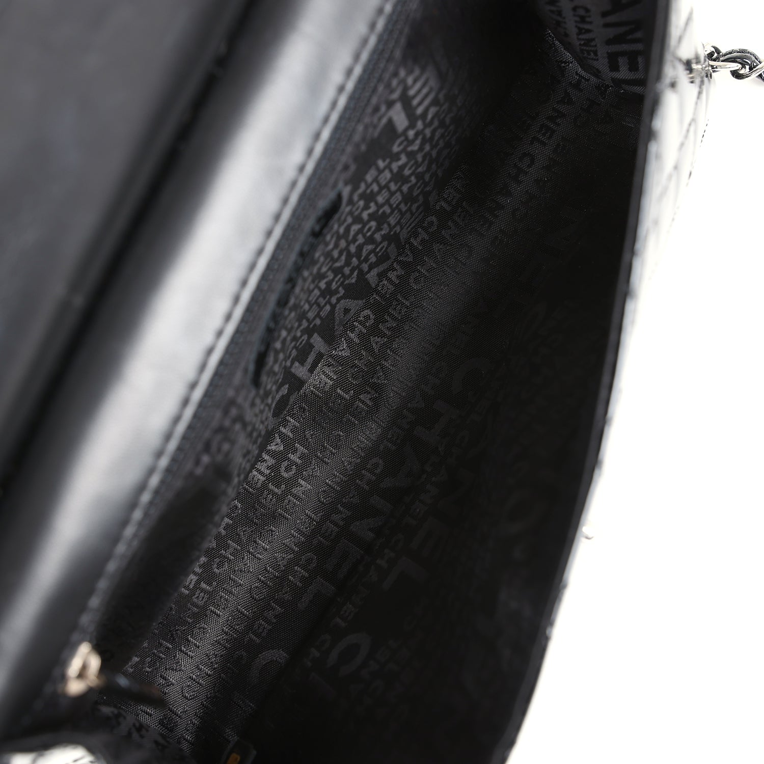 The interior is lined in a black Chanel monogram satin fabric with one zip pocket on rear wall with a chanel zipper pull.