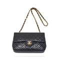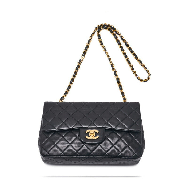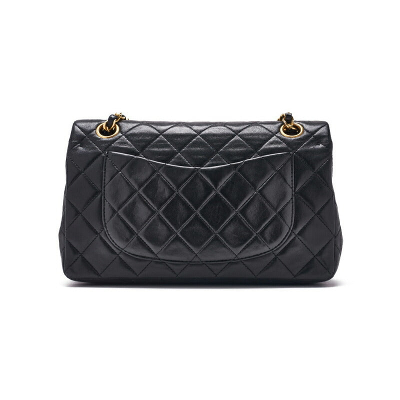 The Vintage Chanel Classic Double Flap Shoulder Bag, size 23 and crafted in sumptuous black lambskin, is an embodiment of timeless luxury and high fashion.