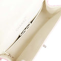 This Vintage Mini Flap Bag is in Pink and White tweed boucle with silver hardware and has a front flap with signature CC turnlock closure and an interwoven silver plated chain link and pink and white tweed shoulder/crossbody strap.