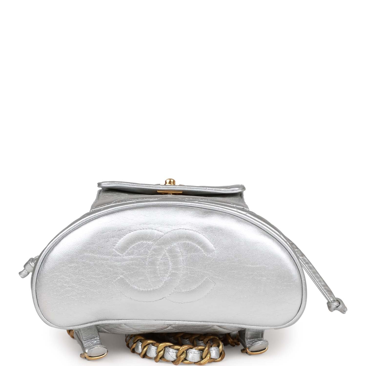 This Vintage Duma backpack is in Silver metallic lambskin with gold hardware, signature CC interlocking closure with front flap, an additional drawstring closure, exterior front pocket, two shoulder strap