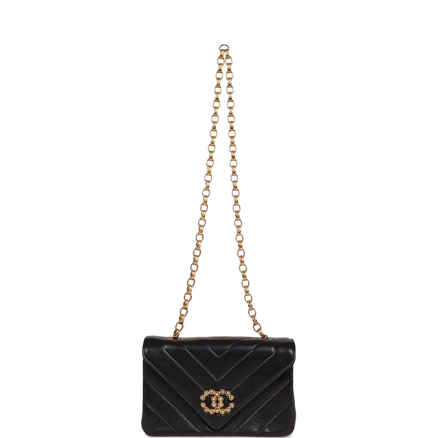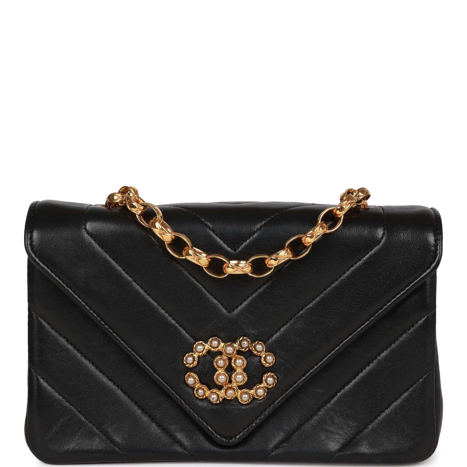 This Vintage Faux Pearl Coco Bijou Mini Flap Bag in Black lambskin with gold hardware, gold plated CC logo snap closure with pearls, and a gold tone chain strap.