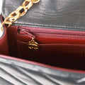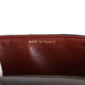 The interior is lined in burgundy leather and includes one zip pocket and a slip pocket underneath on the rear wall.
