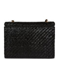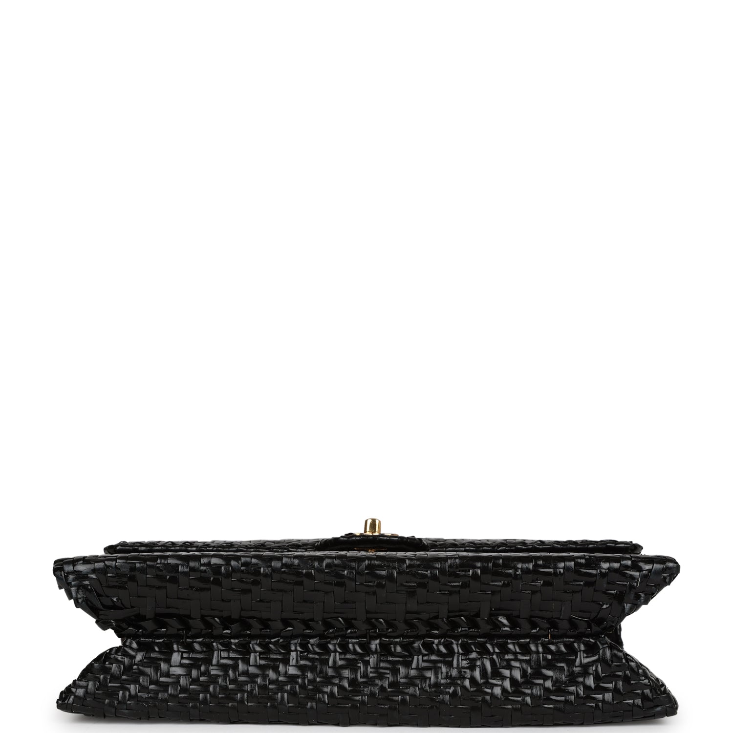 This Vintage flap bag is in Black woven rattan wicker with gold hardware, featuring a front flap with CC turnlock closure, and an interwoven gold plated chain link and black leather shoulder/crossbody strap.