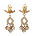 These vintage Chanel chandelier earrings have 24K gold plated textured CC ear clip from which a 24K gold plated and rhinestone diamond and three round rhinestones dangle.