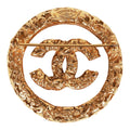 This vintage Chanel brooch is in 24K gold plated lava-textured metal with the CC logo at center enclosed in clear acrylic.