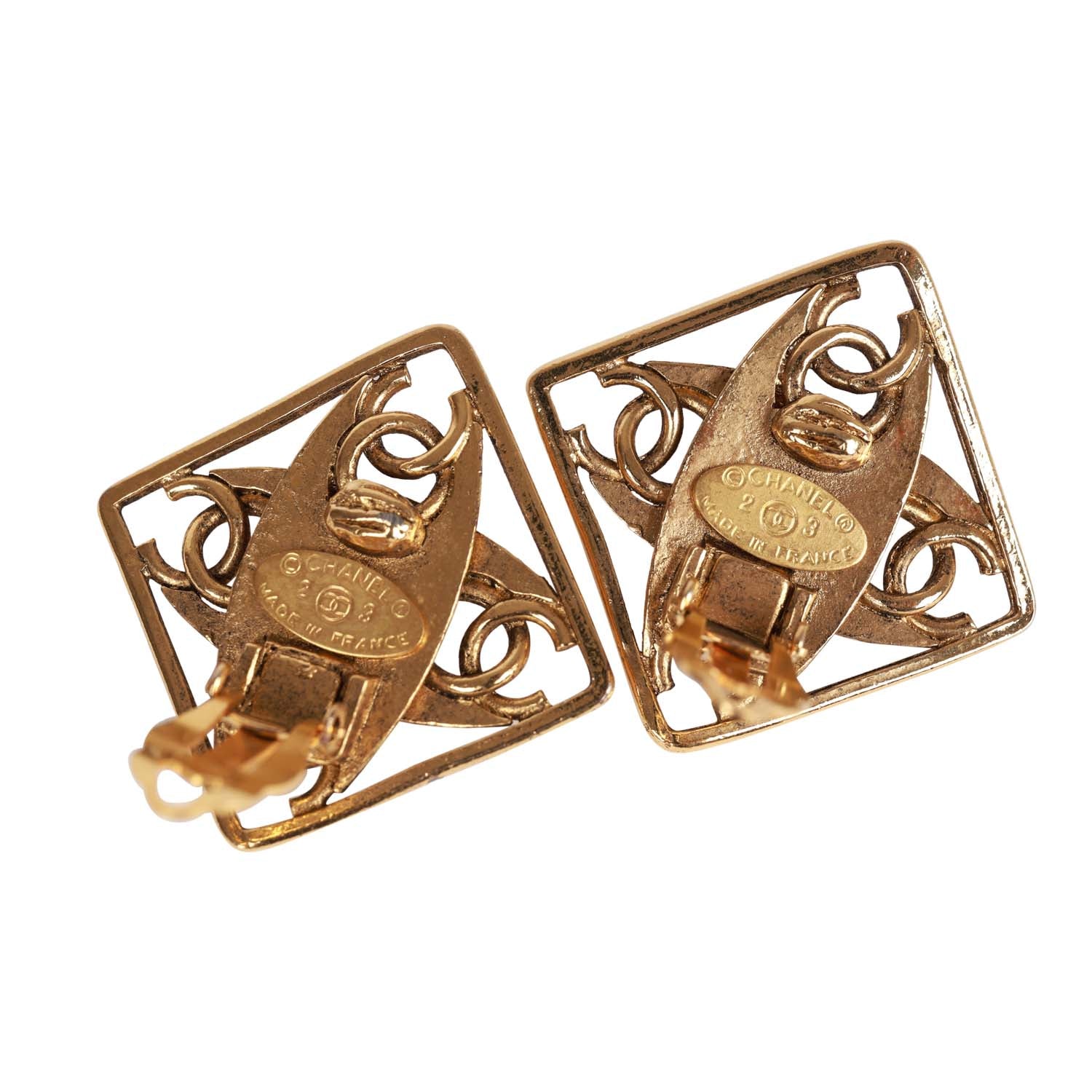 These vintage Chanel collection 23 earrings are in 24K gold plated tone metal with the signature CC logo design and a clip on closure.