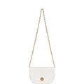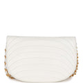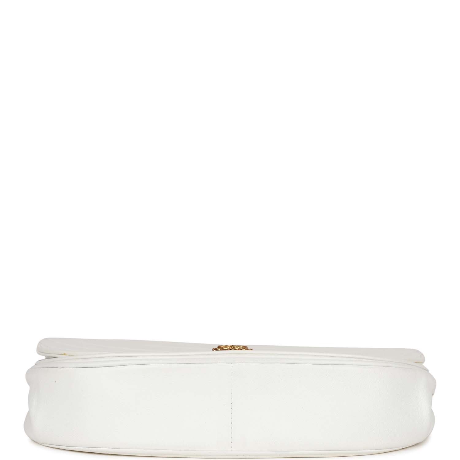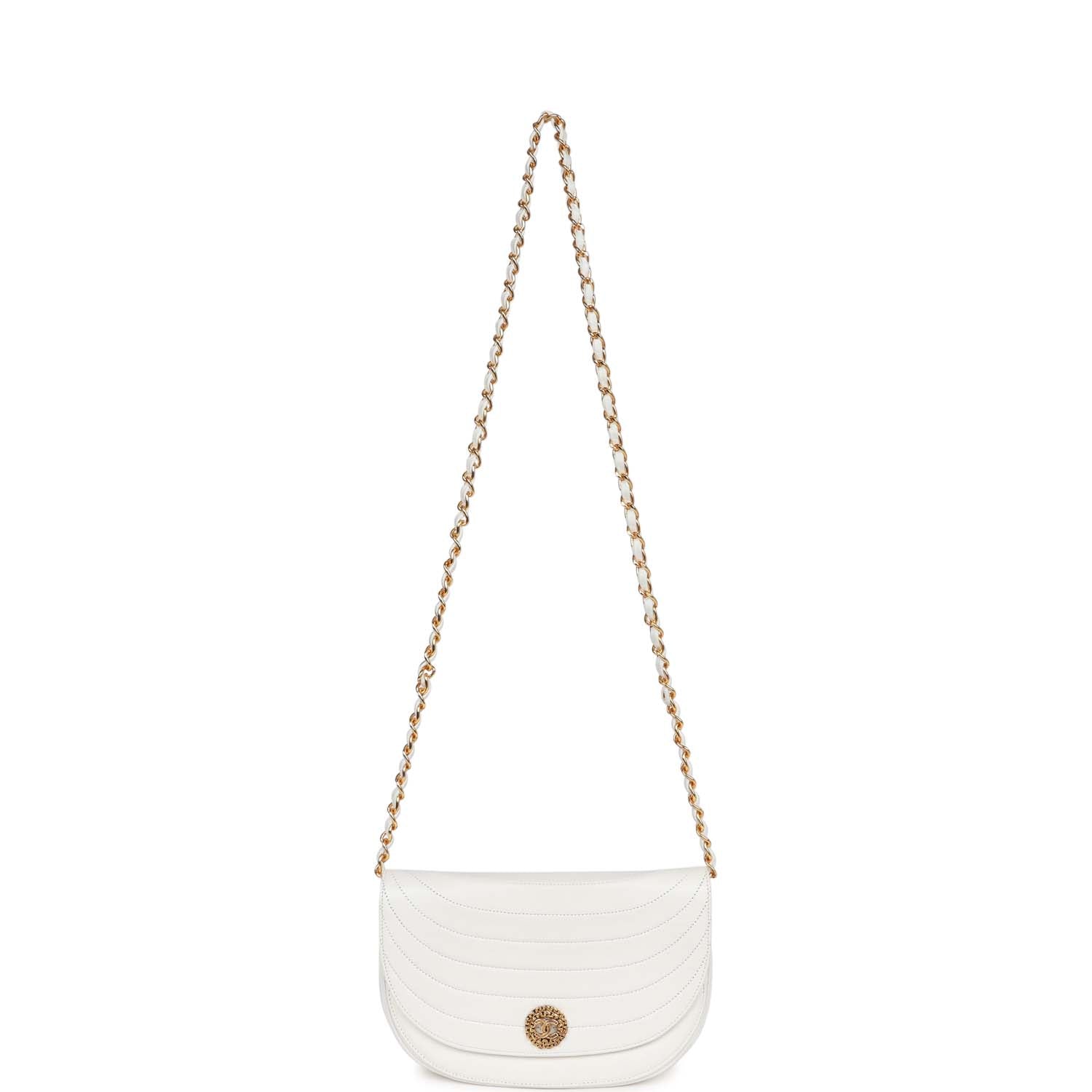 This Vintage Half Moon Shoulder Bag is in white lambskin leather with gold hardware, featuring a front flap with classic gold plated CC snap closure and white leather and gold chain link shoulder/crossbody strap.