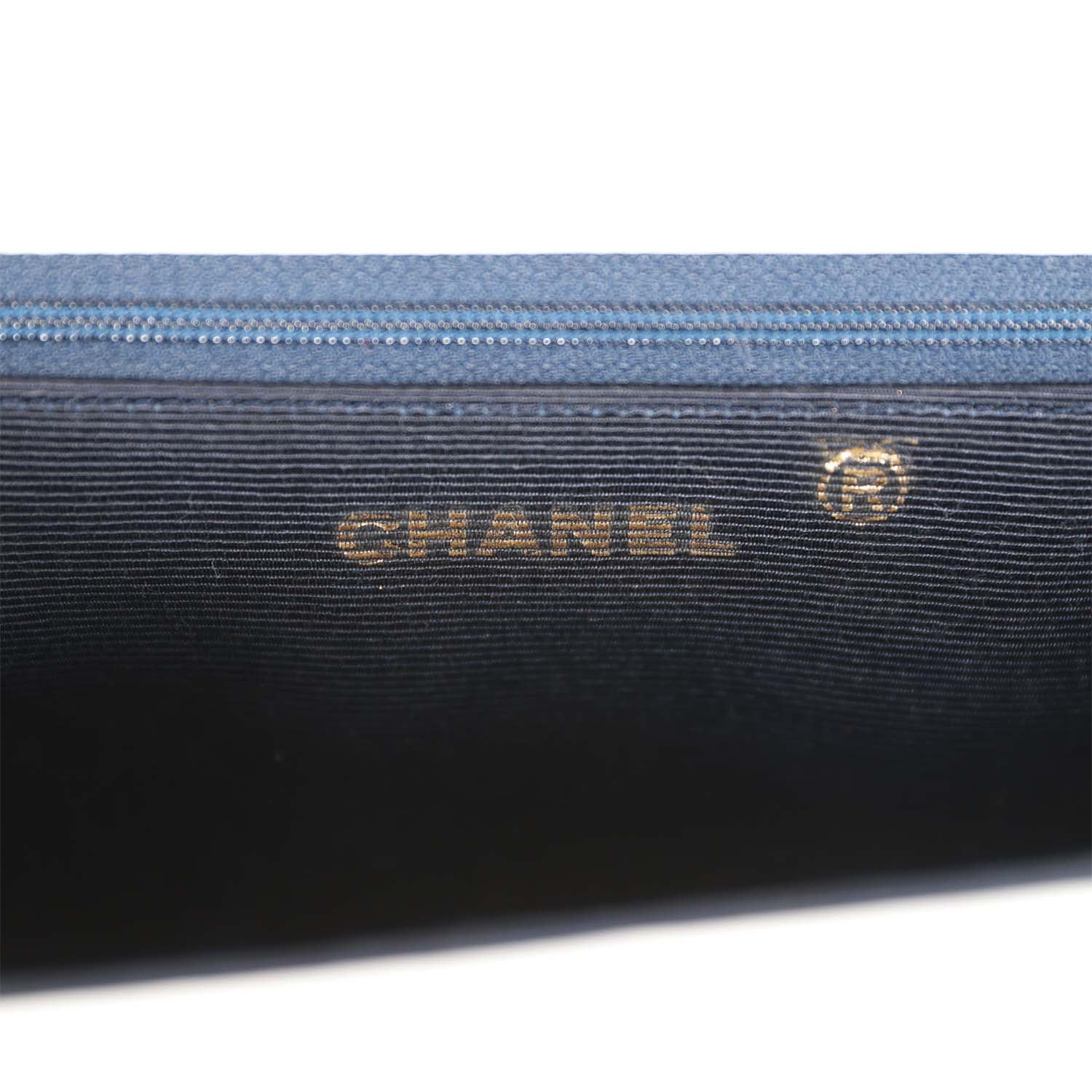 The interior is lined in navy fabric and includes one zip pocket on the rear wall.