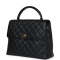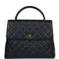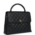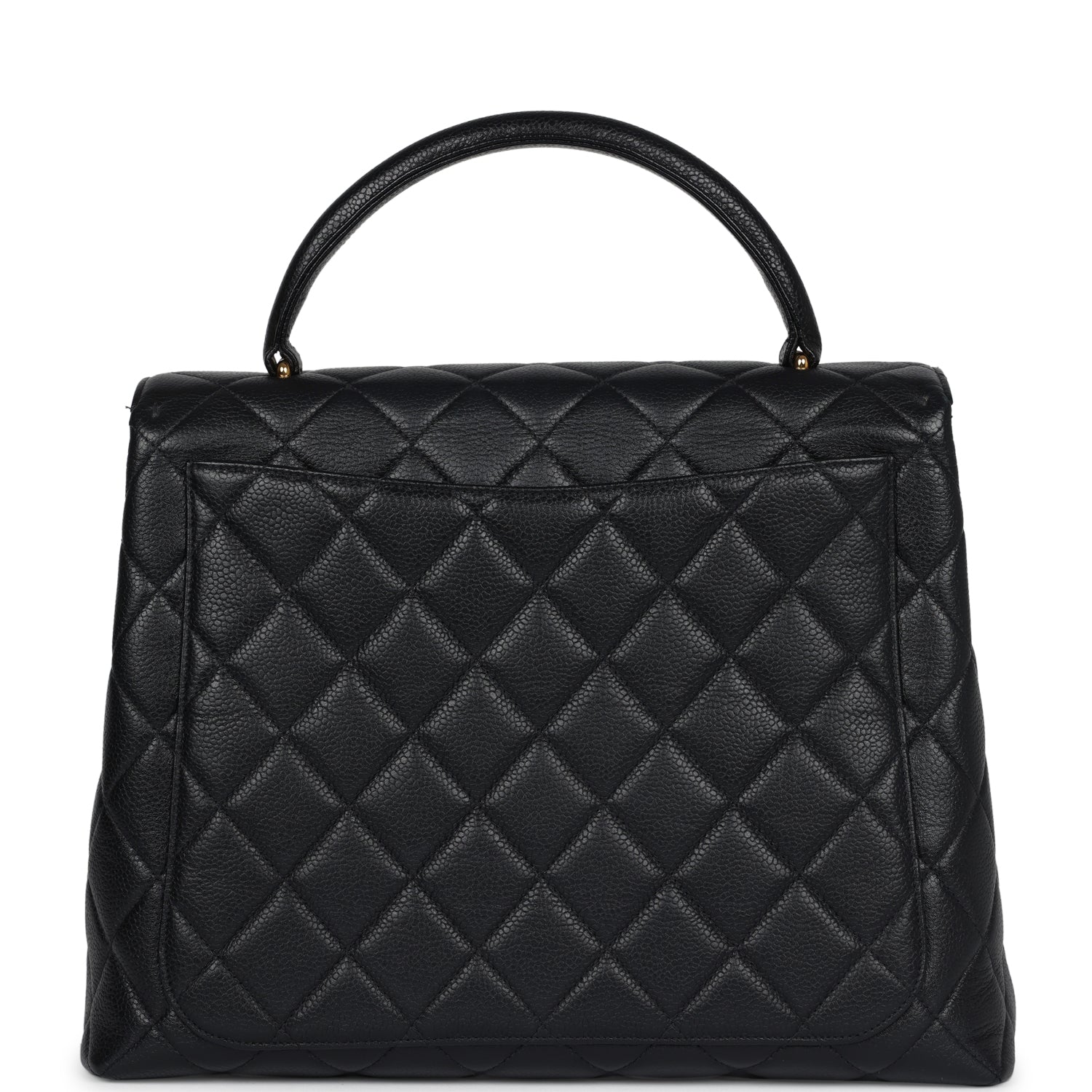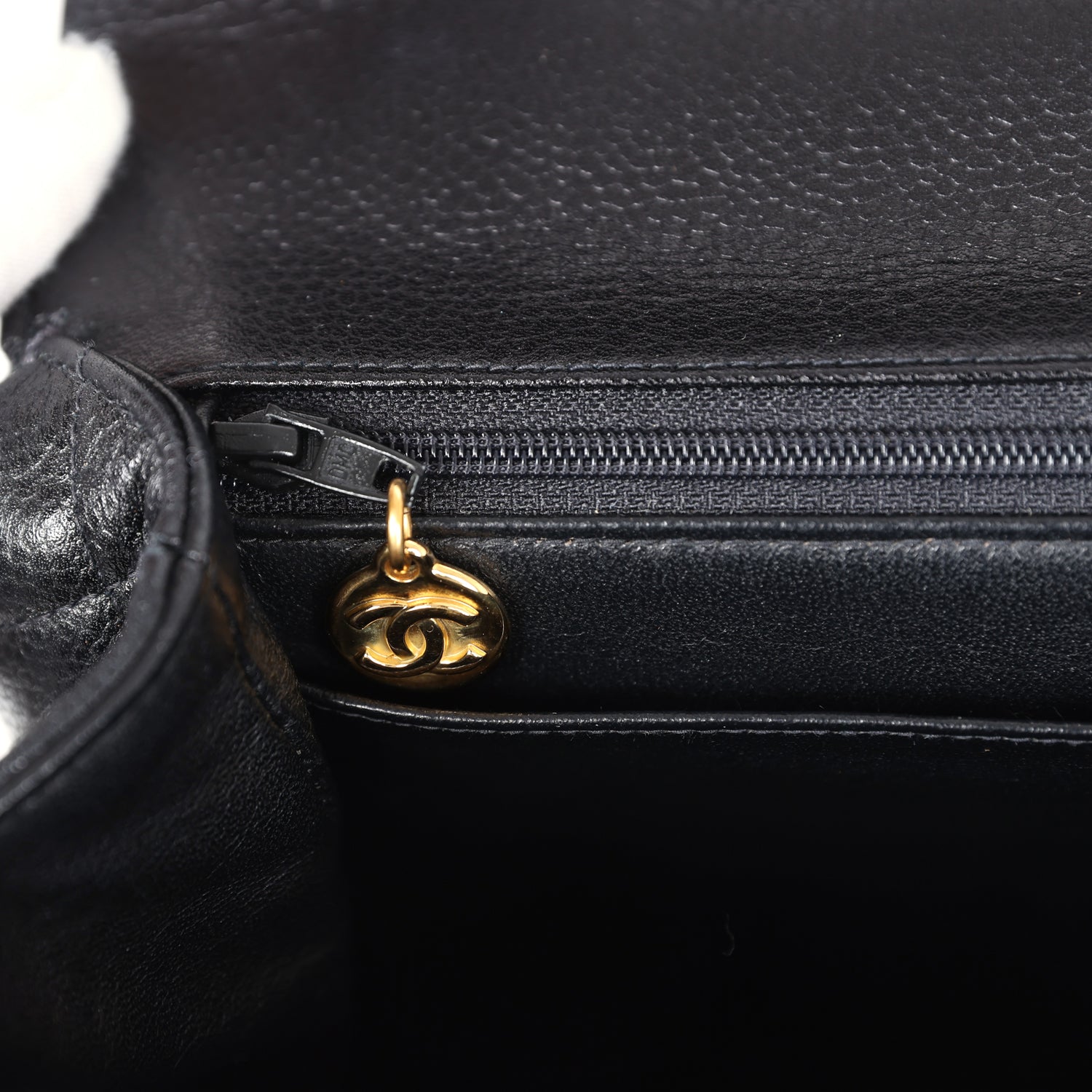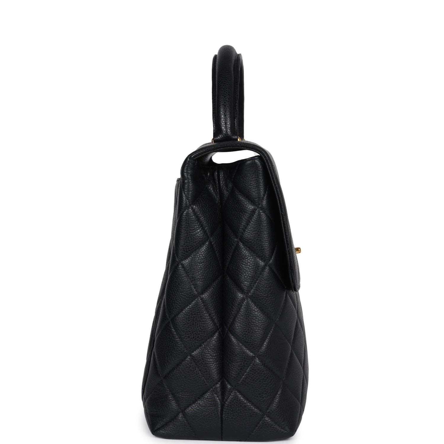 This vintage Chanel Kelly Top Handle Flap Bag is in black caviar leather with gold hardware, featuring the signature CC turnlock closure with front flap, half moon back pocket and a black rolled top handle.