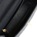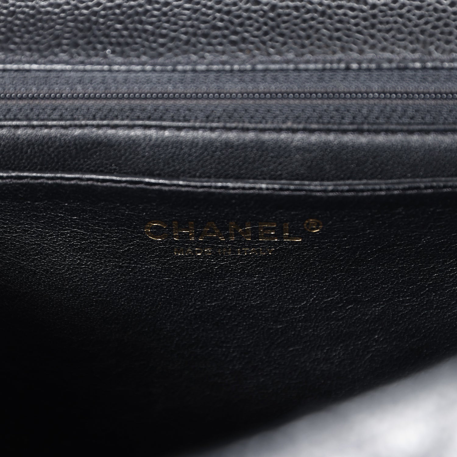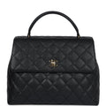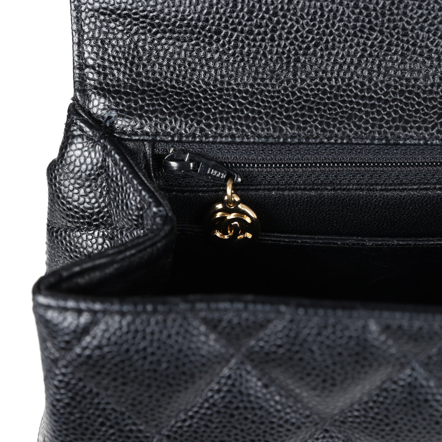 This vintage Chanel Kelly top handle flap bag is in black caviar leather with gold hardware, features the signature CC turnlock closure with front flap, half moon back pocket and a black rolled top handle.