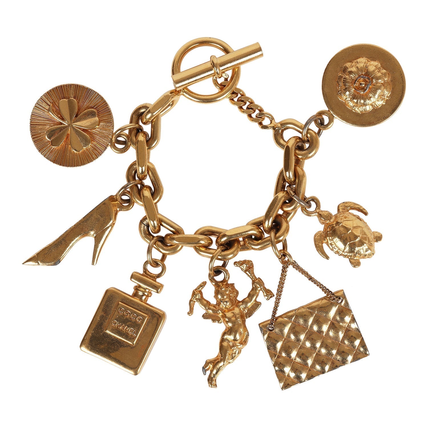 This 80's iconic vintage Chanel lucky charms bracelet features a 24K gold plated chain link with seven of Chanel's "iconic" lucky charms including a clover, shoe, perfume bottle, cherub, Chanel quilted handbag, turtle, and camellia flower. It also has a bar toggle and loop closure.