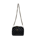 This Vintage Vanity Case Bag is in Black quilted patent leather with gold hardware, a zip around closure, an interwoven leather and gold plated chain link top handle, and a detachable interwoven Black leather and gold plated chain link shoulder strap