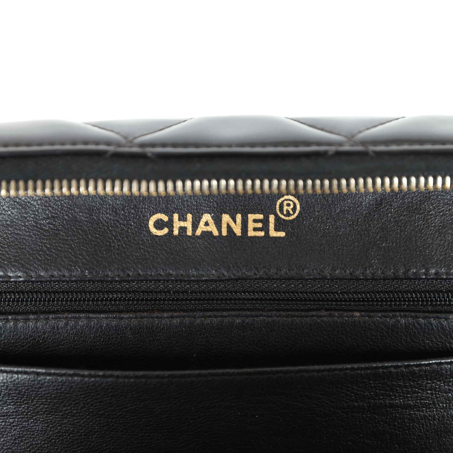 The interior is lined with Black patent leather and has one zip pocket with a CC logo pull and an open slip pocket underneath on the back wall.