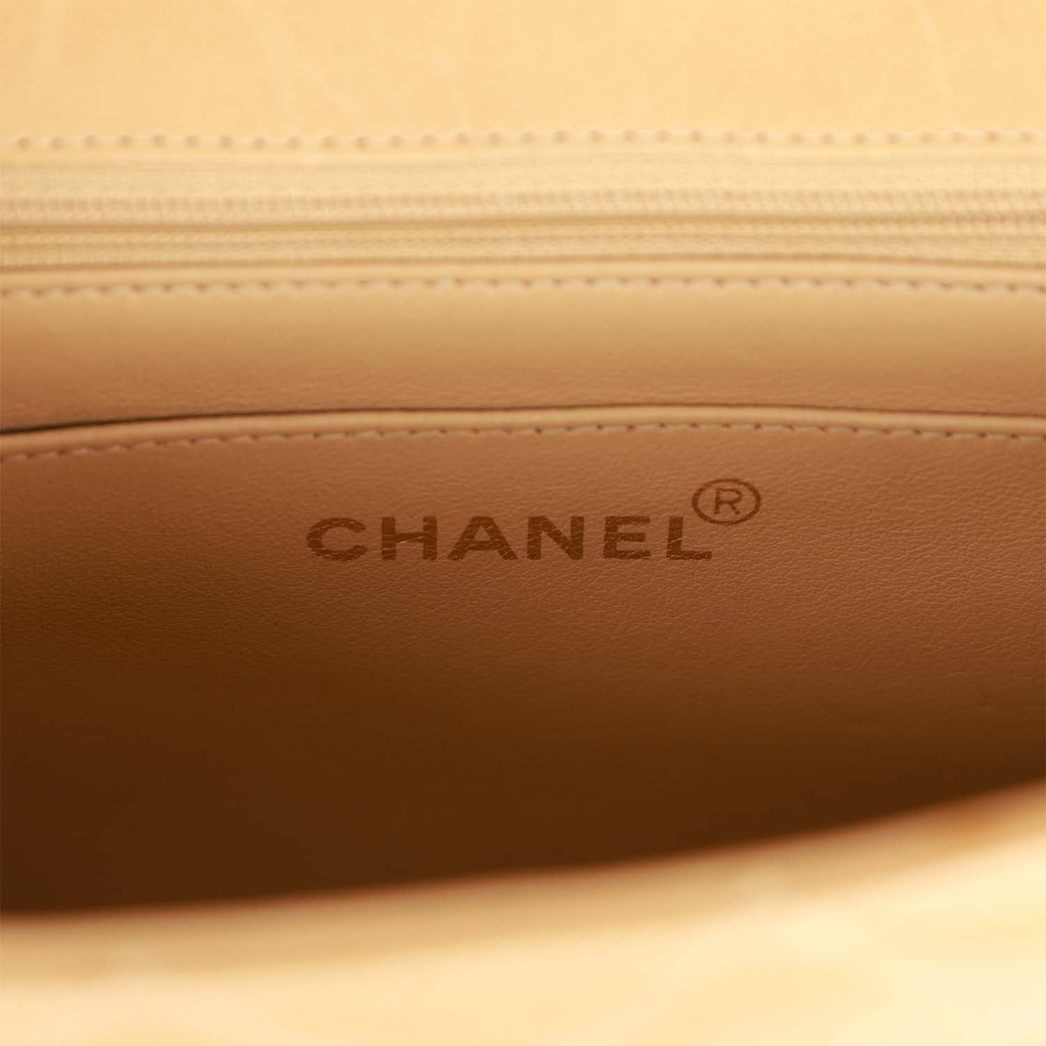 The interior is lined in beige leather and has one zip pocket with a CC logo pull and a slip pocket below on the rear wall.