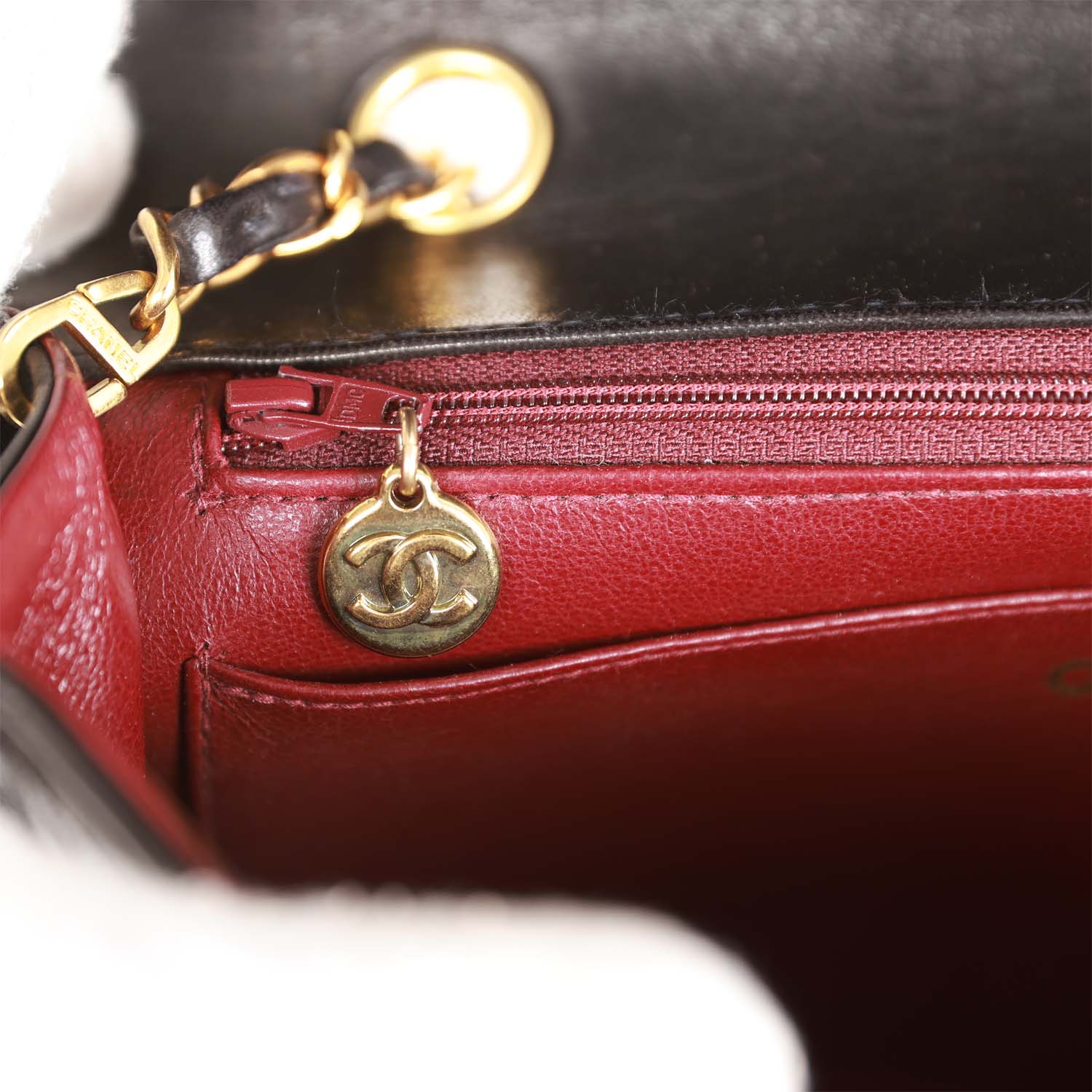 This Vintage Diana flap Bag in Black lambskin leather with gold hardware, featuring a front flap with classic gold plated CC turnlock closure and black leather and gold chain link shoulder/crossbody strap.