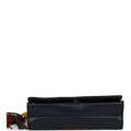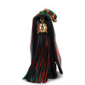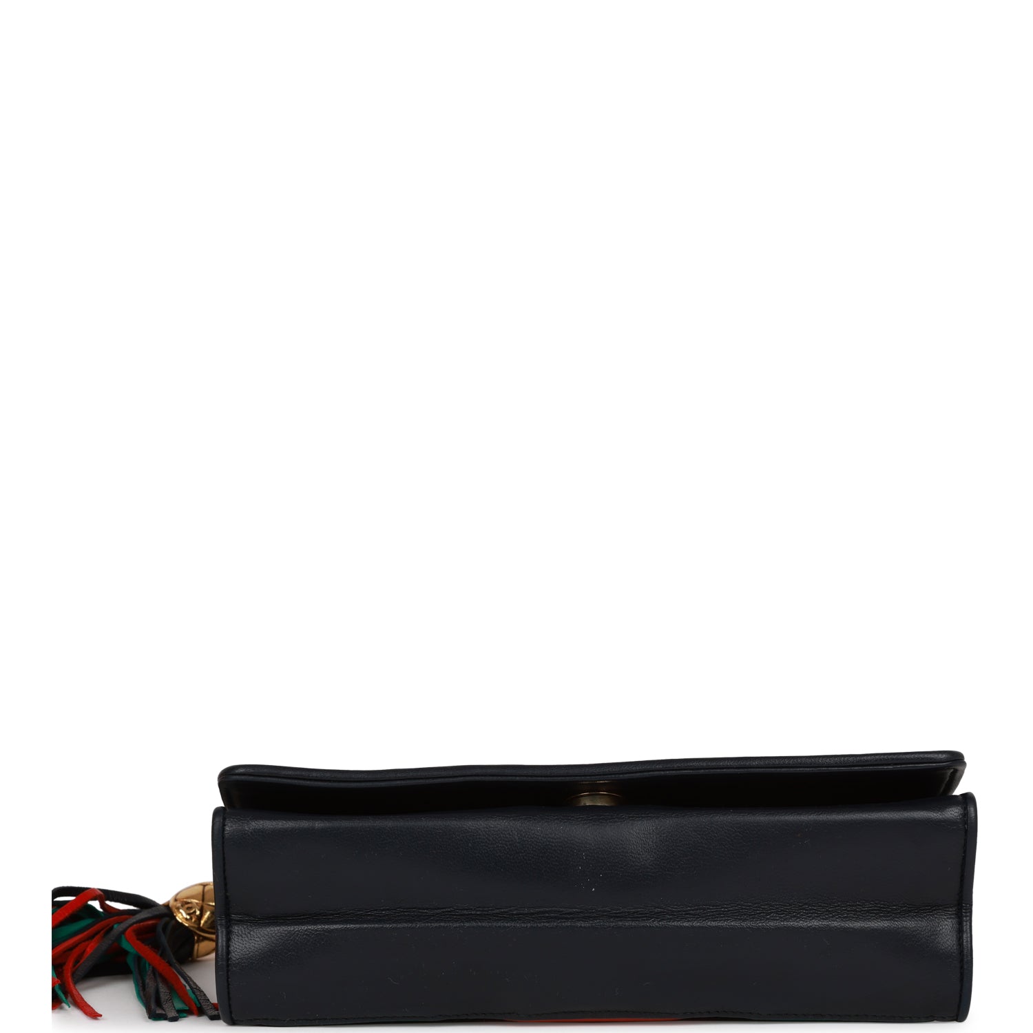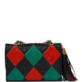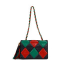 A Vintage Chanel Harlequin flap Bag in dark blue, red and green lambskin with gold hardware, featuring a front flap, side tassel and red and green leather and gold chain link shoulder strap.