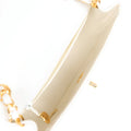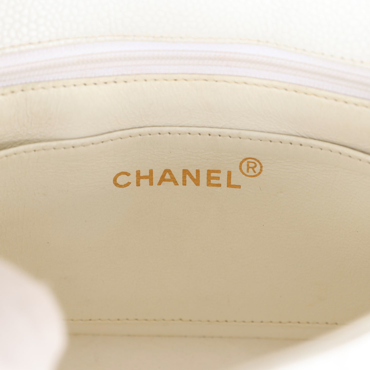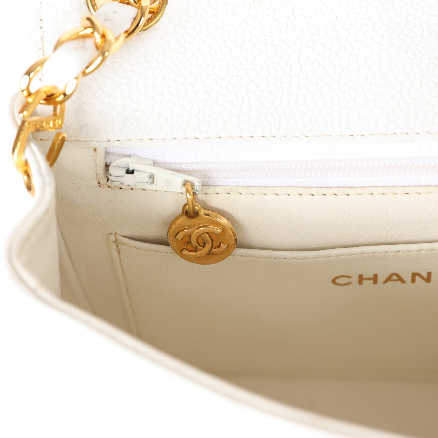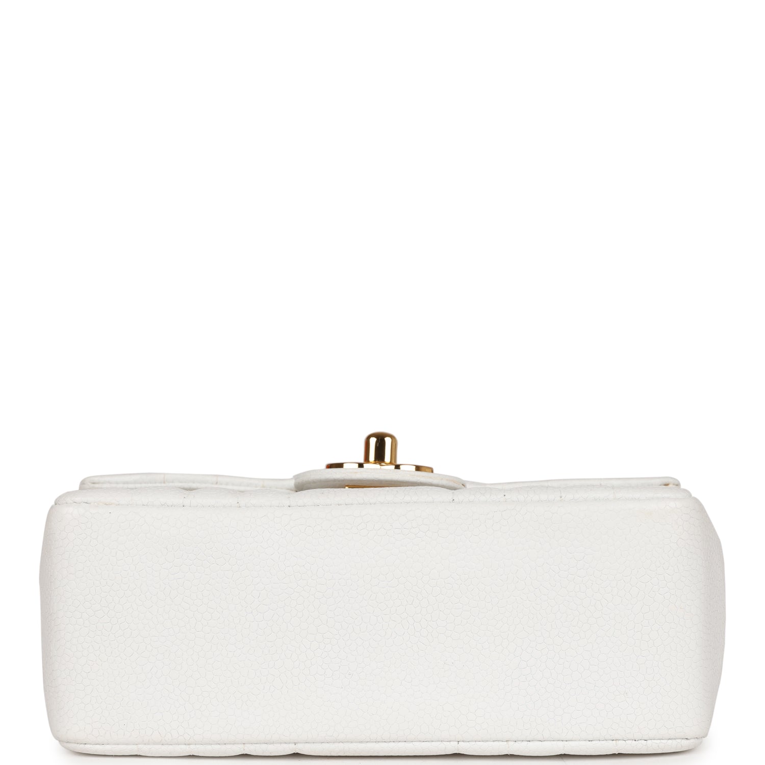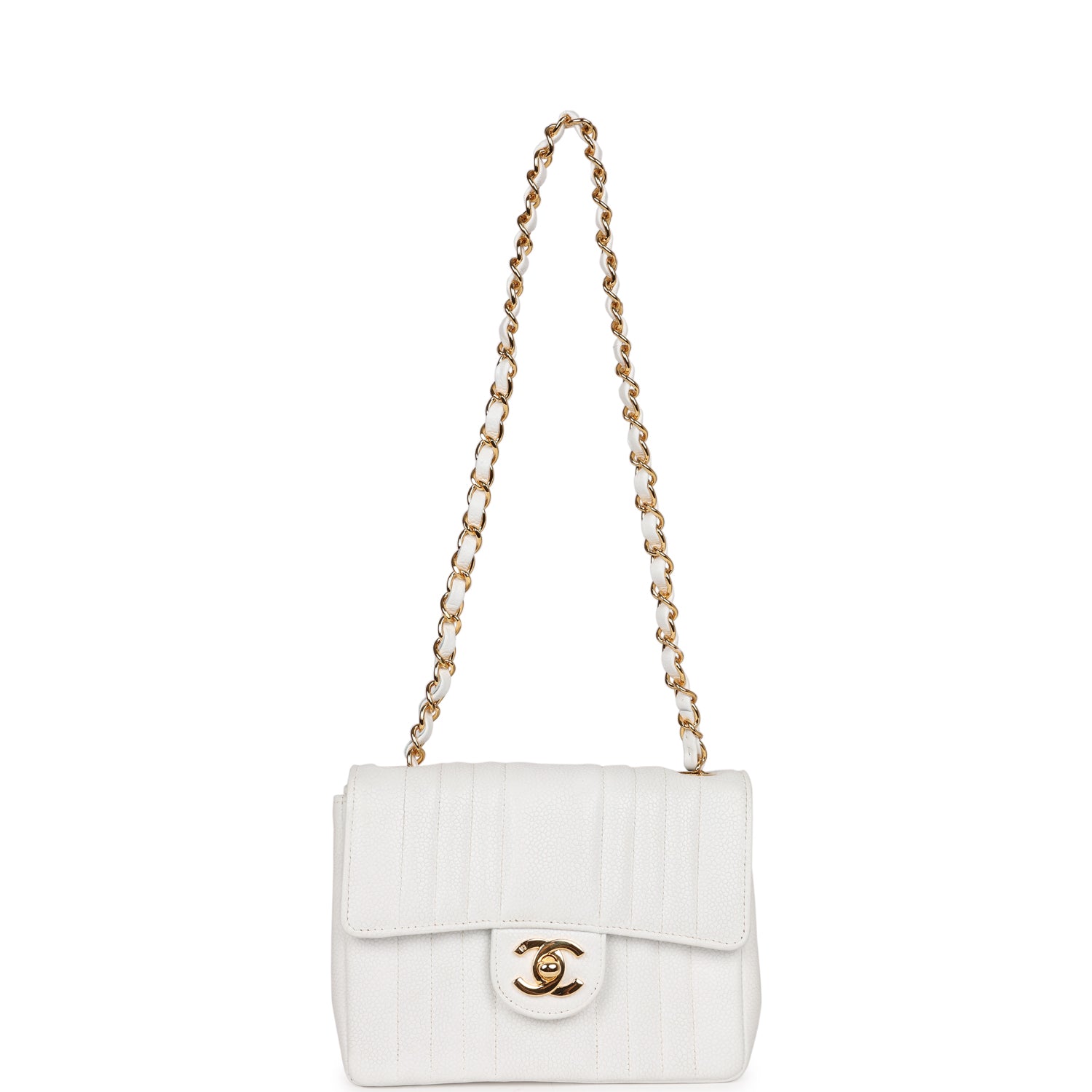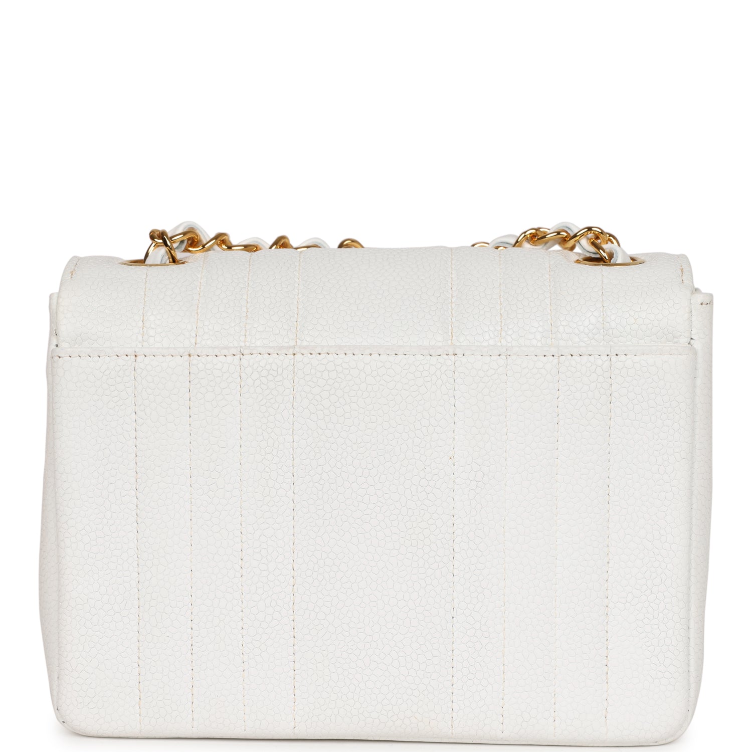 This Vintage Mini Square Flap Bag with Vertical Quilting is in White Caviar with Gold Hardware, front flap with CC turnlock closure, and an leather interwoven gold chain and white leather shoulder strap