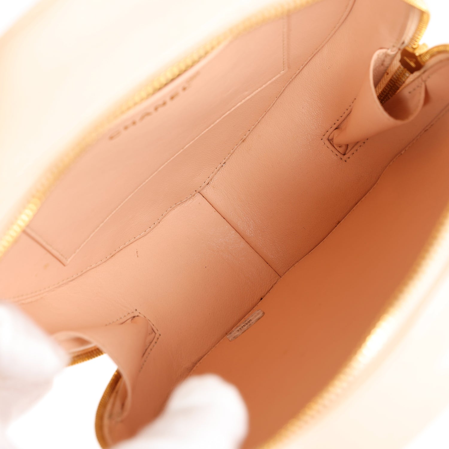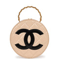 This Vintage Round Vanity Case is in Beige and Black quilted patent leather with antique gold hardware, stitched CC Logo on front, double zipper closure, and interwoven patent leather and antique gold top handle.