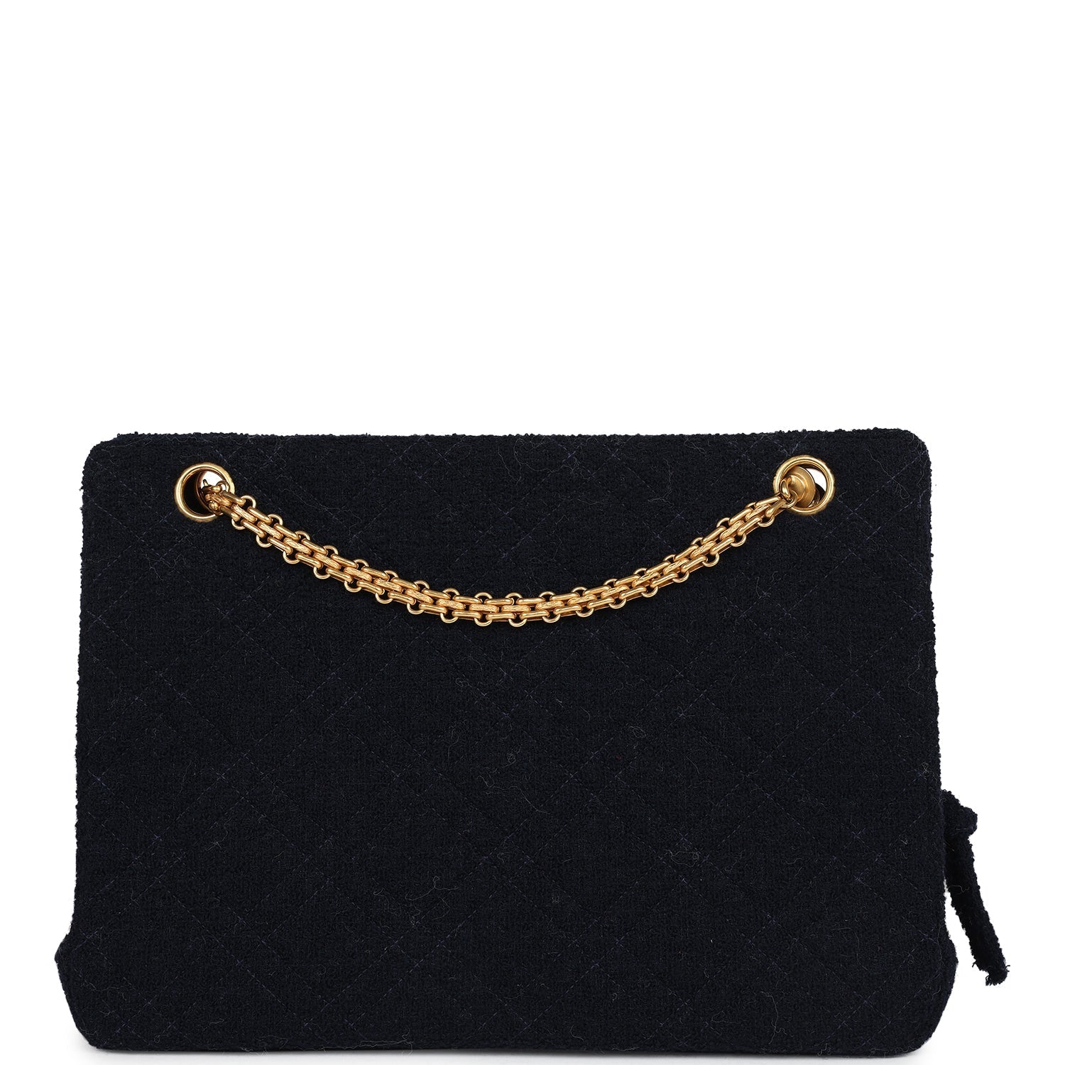 This vintage Chanel quilted shoulder bag is in navy tweed fabric with gold Hardware, featuring quilted tweed, a zipper closure and a single gold chainlink reissue shoulder strap