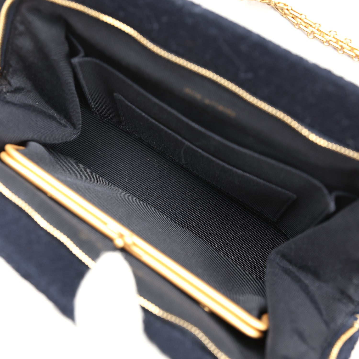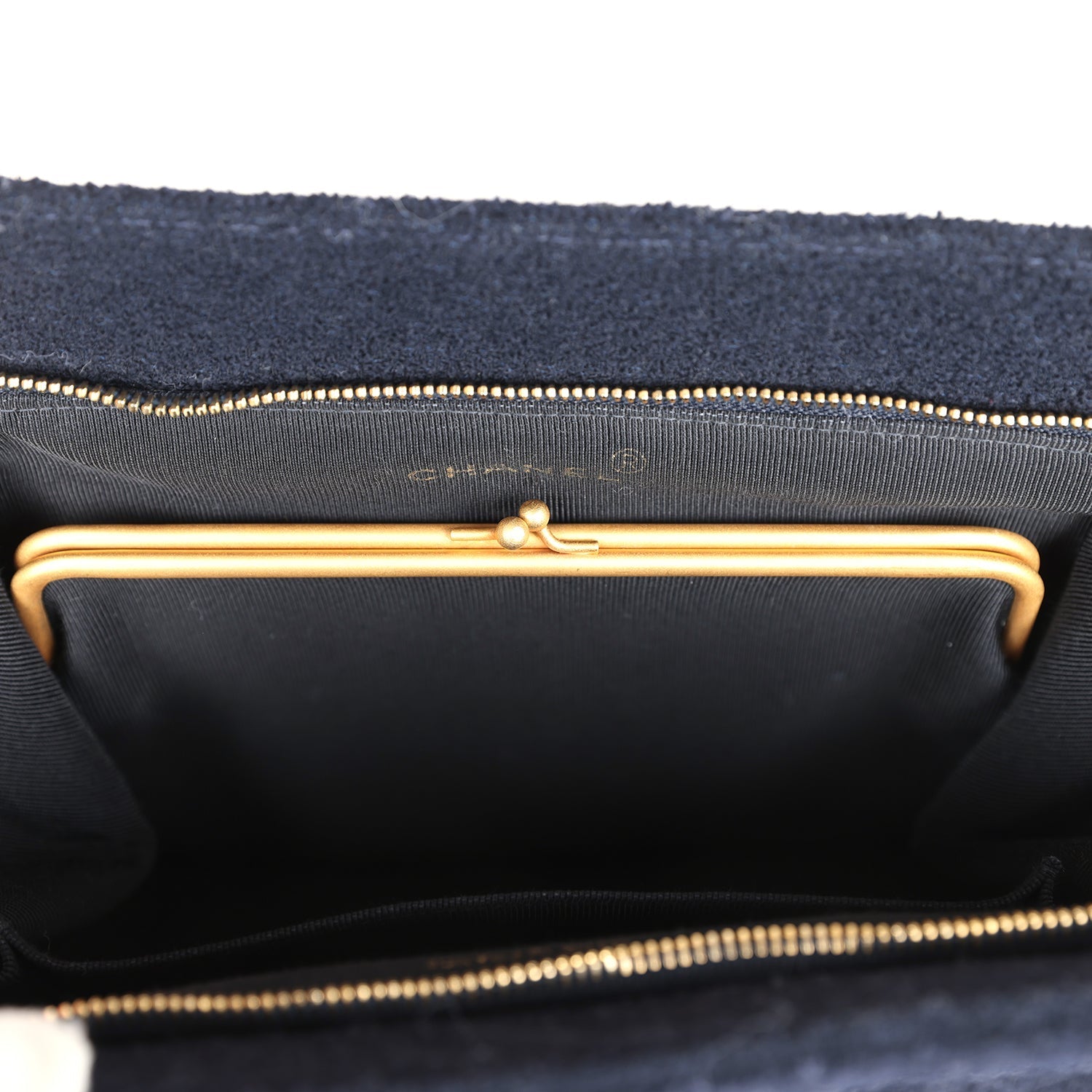 The interior is lined in navy grossgrain fabric and has two small slit pockets on rear wall and one removable kisslock pouch.