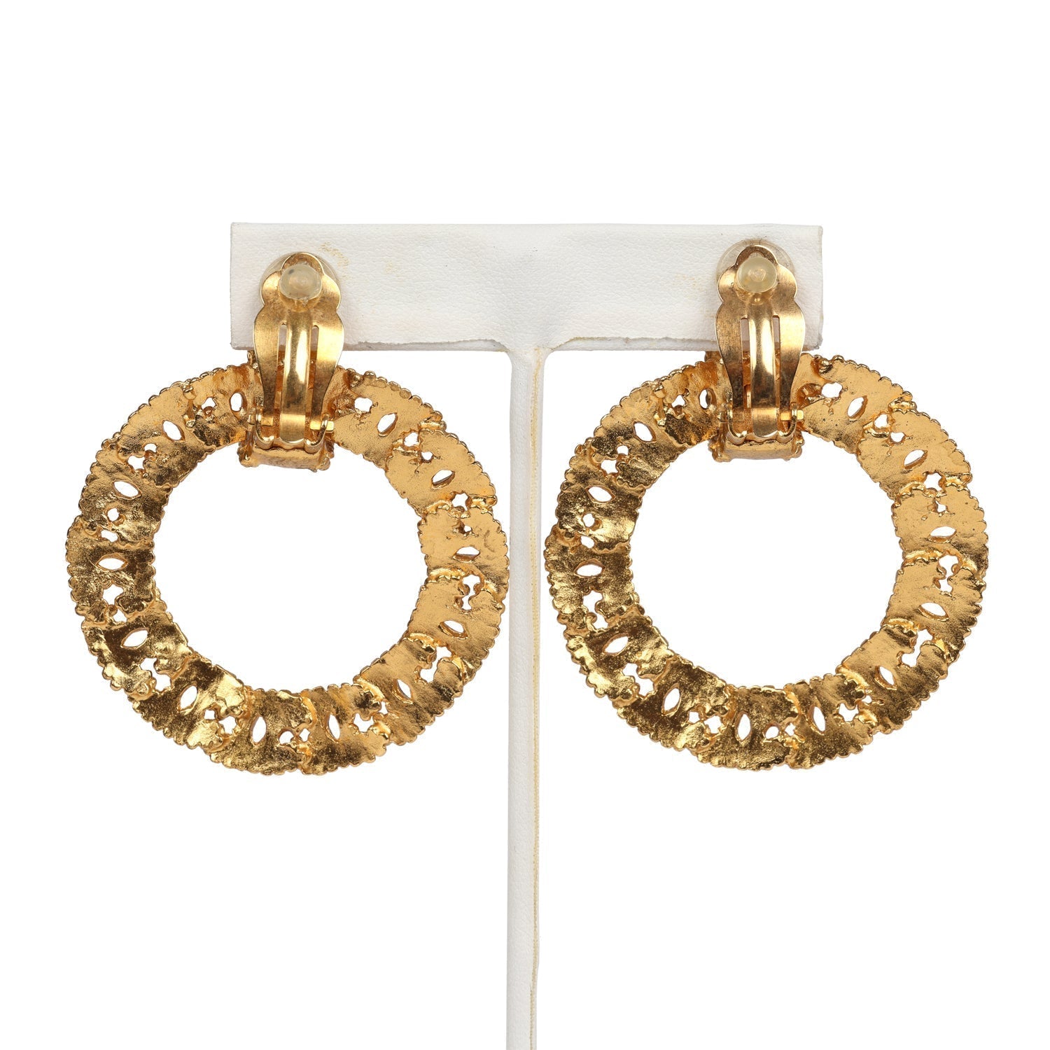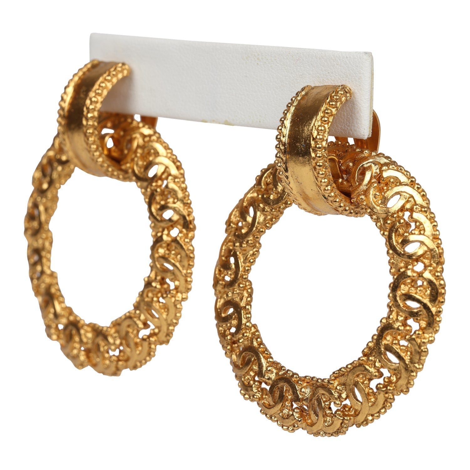 These 1996 vintage Chanel small door knocker CC hoop earrings in 24K gold plated hardware, feature interlocking border CC motif design attached to a small clip on hoop. These have a clip on back closure.