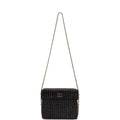 This Vintage Wicker Picnic Basket Bag is in Black woven rattan with gold hardware, featuring a top basket closure, embossed gold CC on front, and and a gold plated chain link shoulder/crossbody strap.