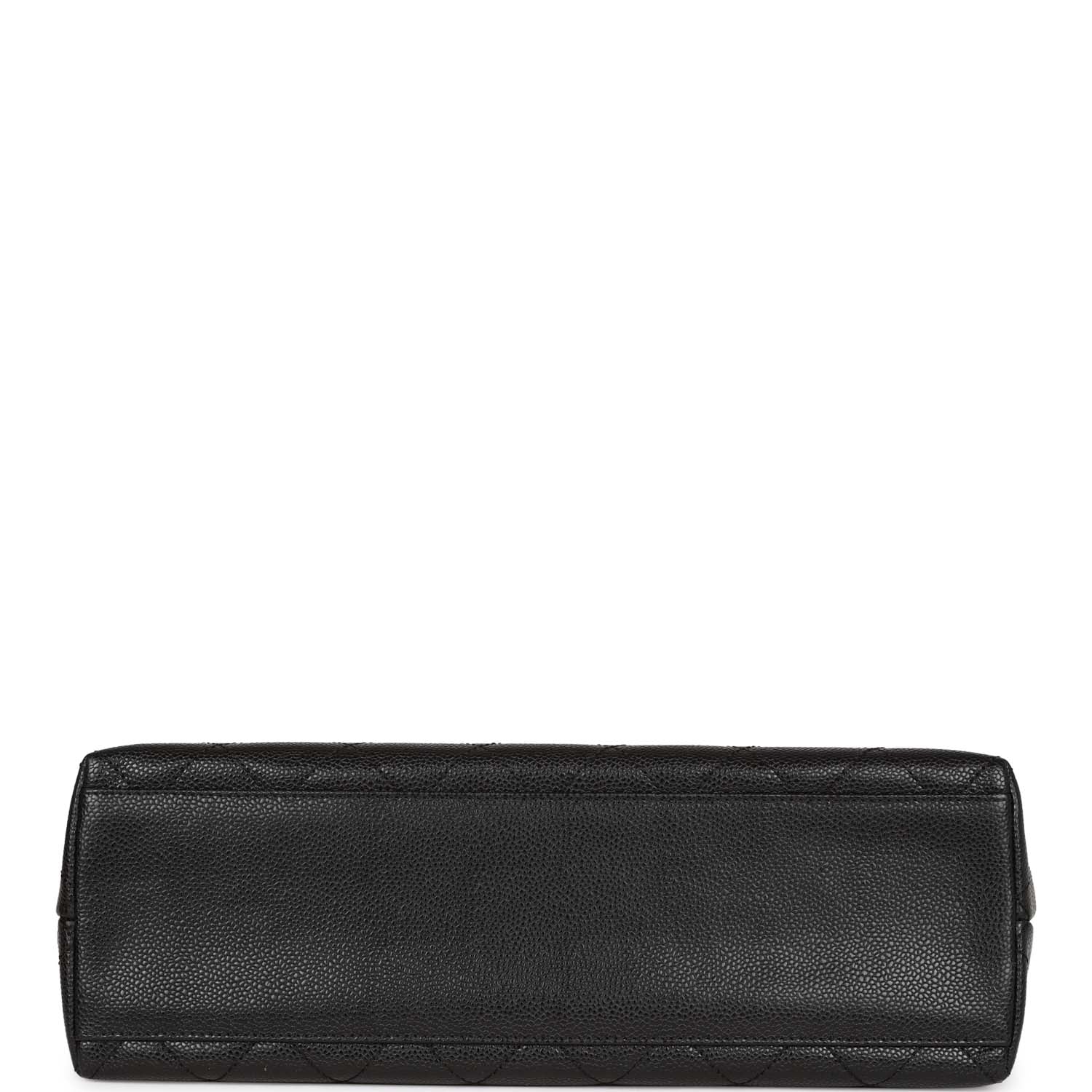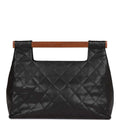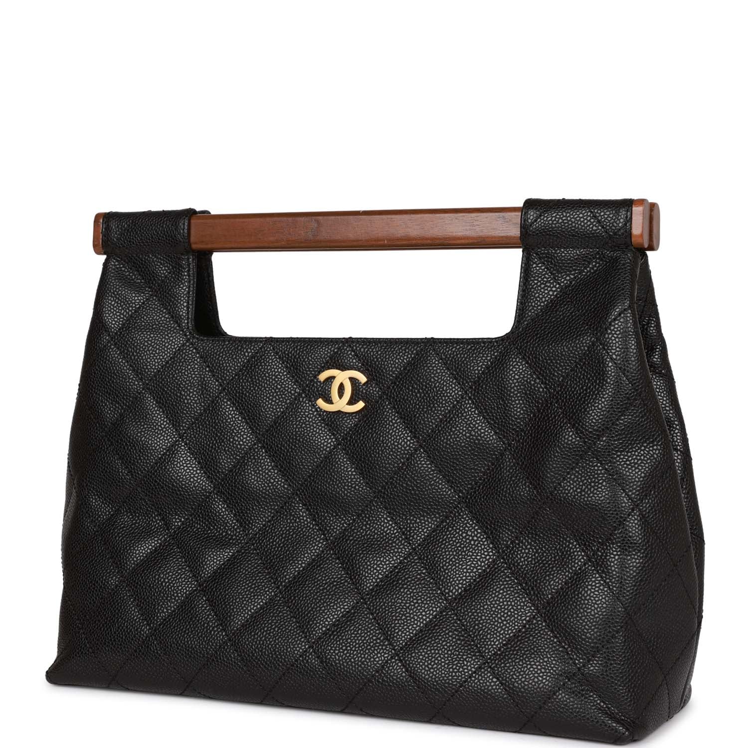 This Vintage Wood top handle Bag is in Black quilted caviar leather with gold hardware, a wooden top handle with magnet closure, a signature CC design hardware, and an open top.