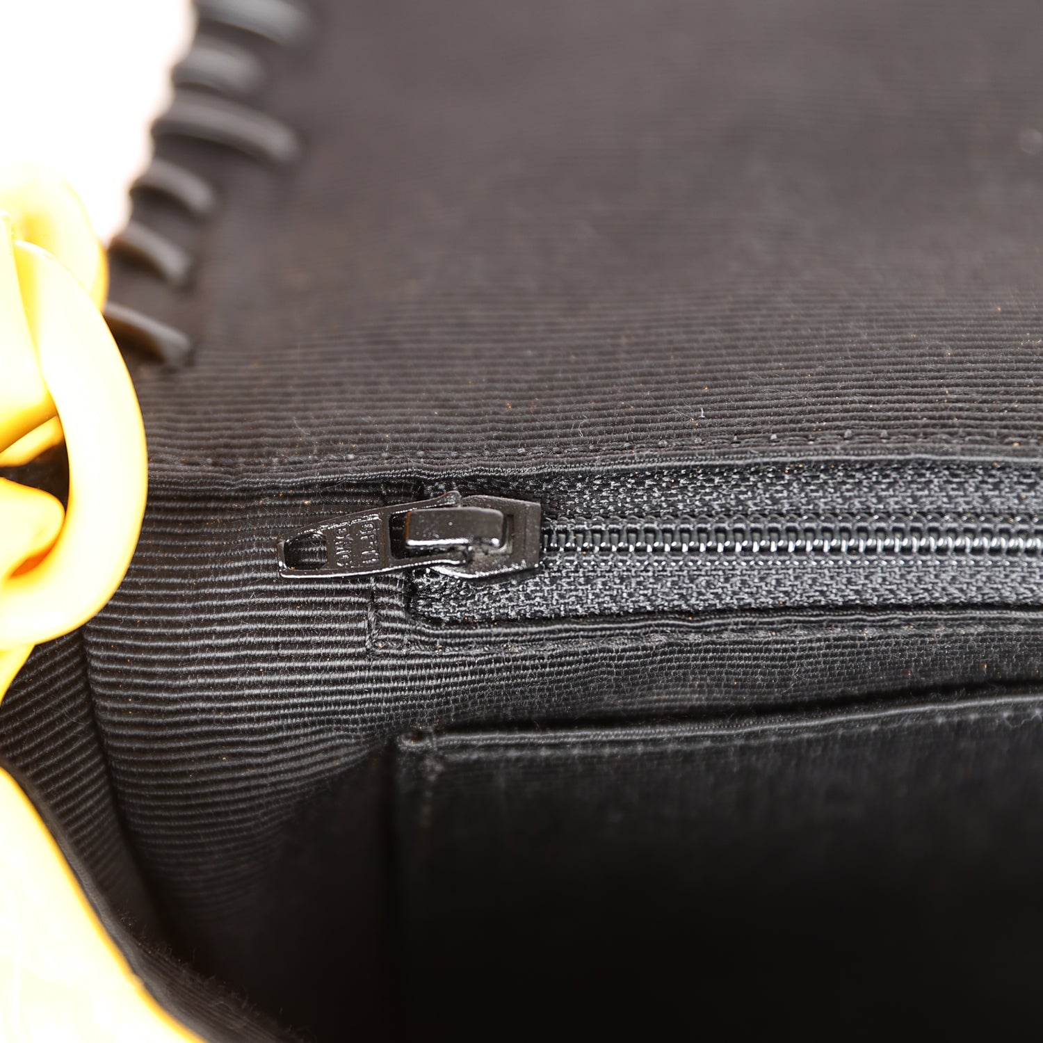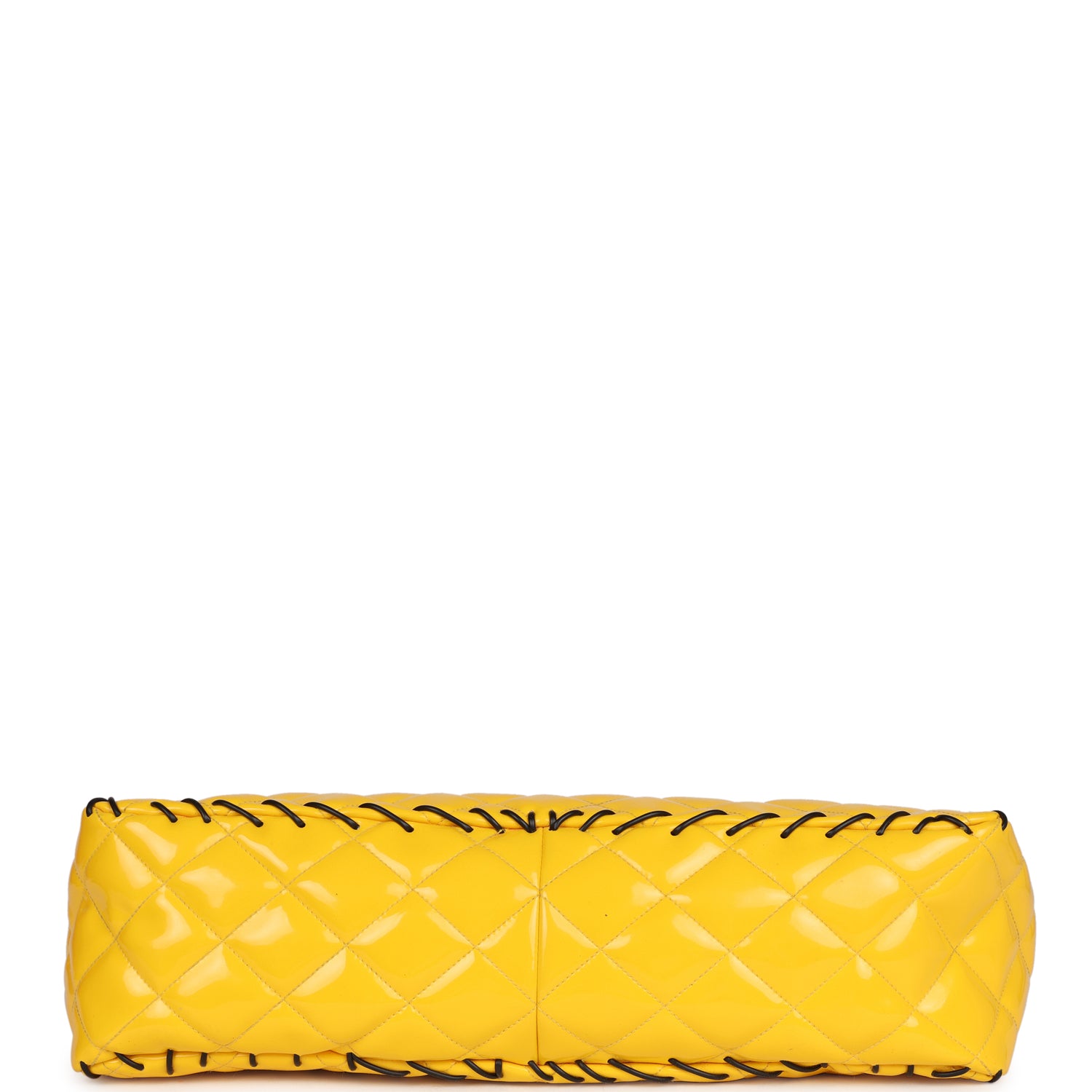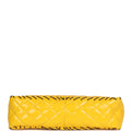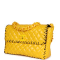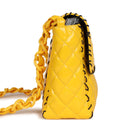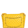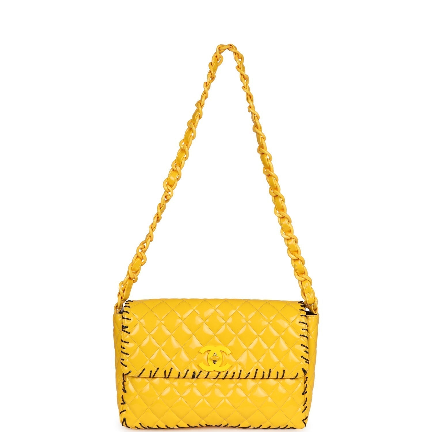 This Vintage XL Jumbo Stitch Flap Bag is in Yellow Patent Leather with Yellow Acrylic Hardware, tonal stitching, black contrast decorative stitching, and an interwoven yellow chainlink and leather shoulder/crossbody strap.