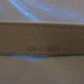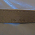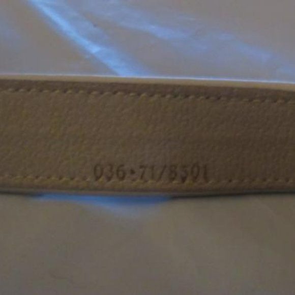 The belt has an embossed Gucci crest and '65-26' at the end opposite from the buckle. Towards the buckle, there is a serial # of 036 71 6501.